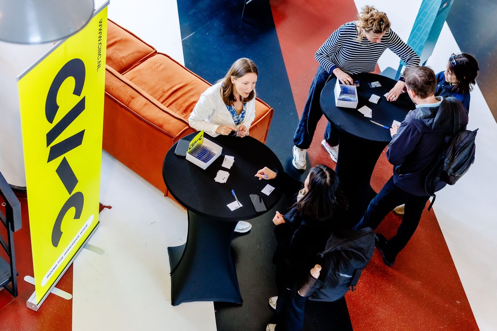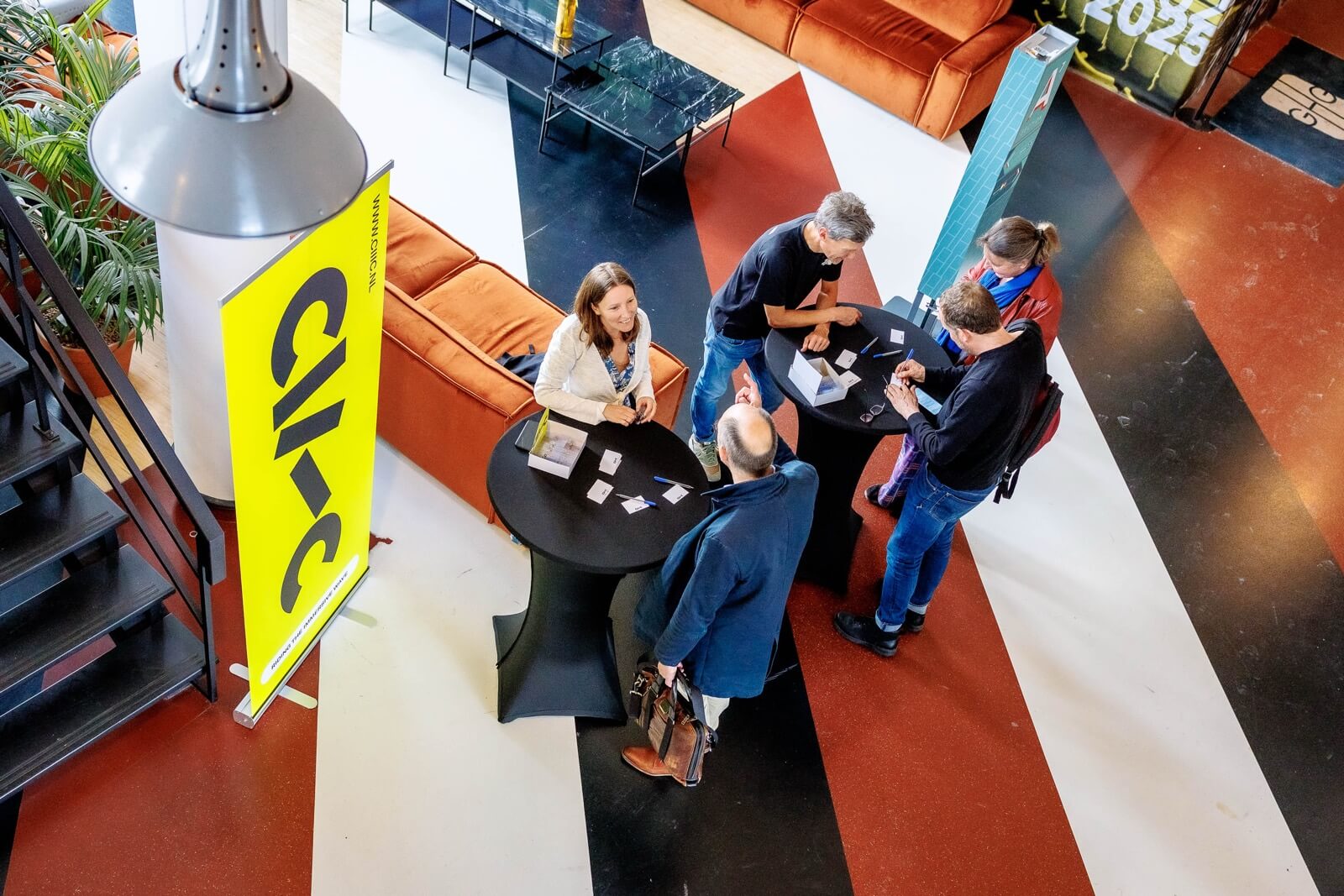 Overhead view of people interacting at a CIIIC Annual Meet-up booth with name tags and a yellow banner nearby.