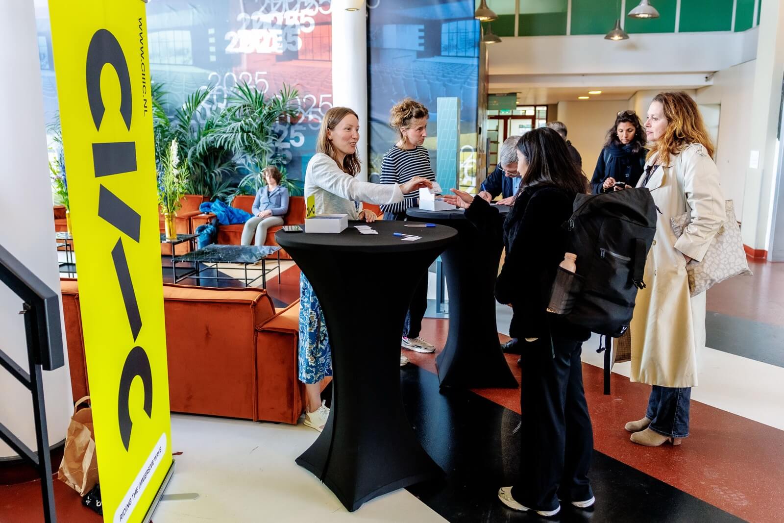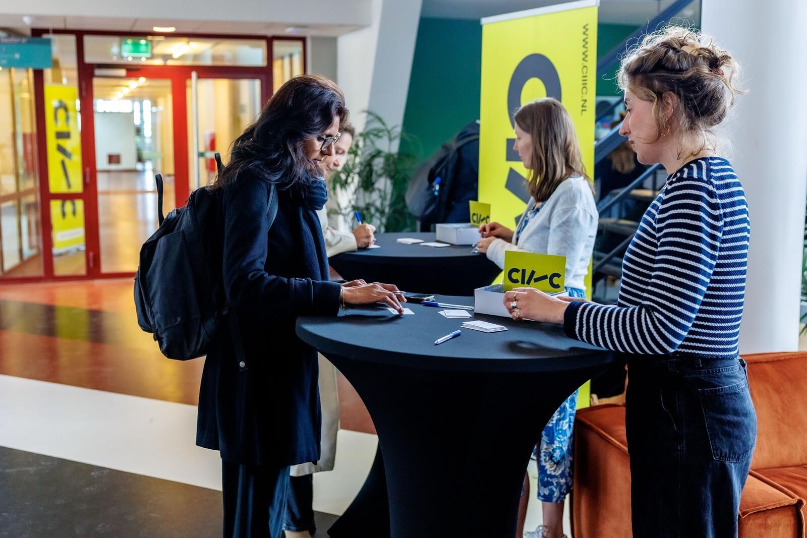 People at a table during the CIIIC Annual Meet-up, a woman hands out name tags at a registration desk.