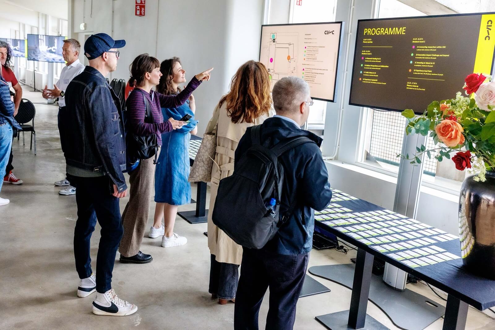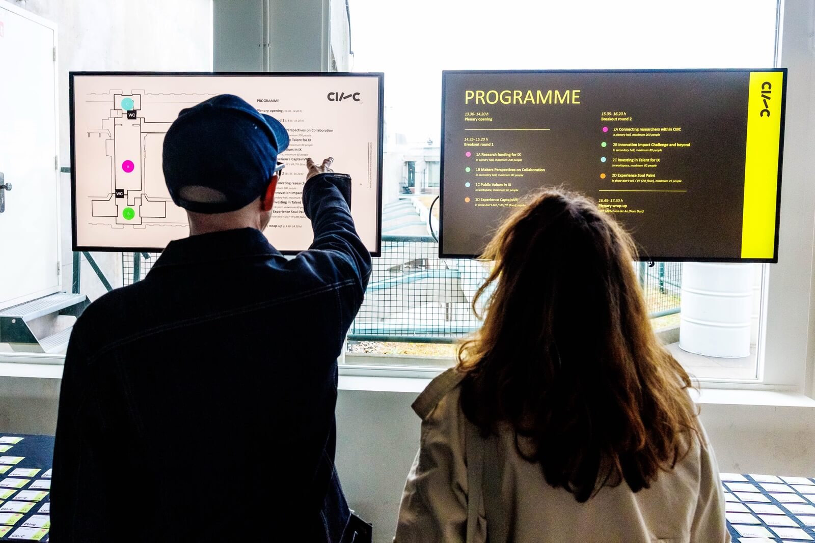 Two people look at large screens displaying a CIIIC event program and a venue map, one person points at the map.