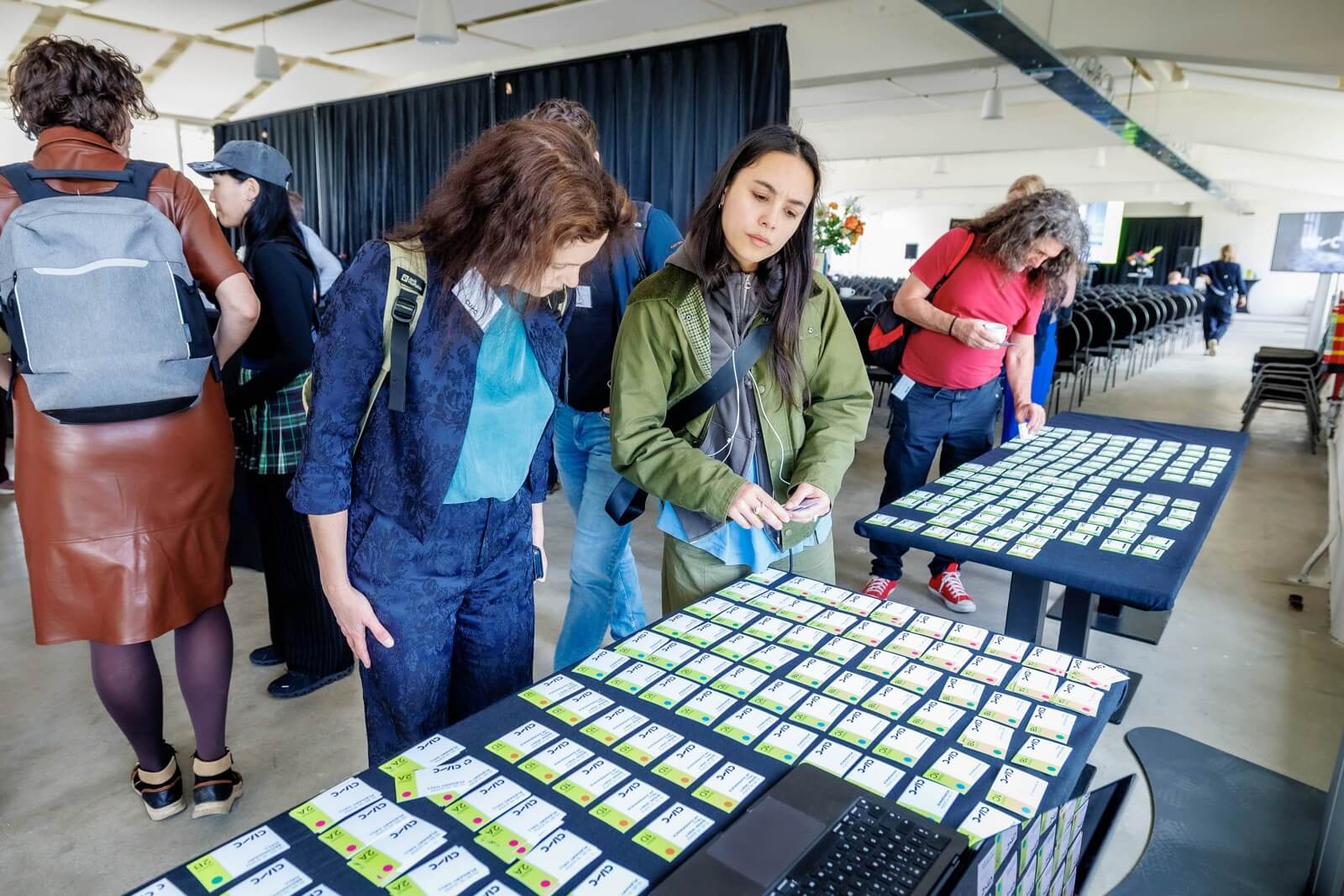 Attendees at the CIIIC Annual Meet-up are selecting name badges from a table in a conference hall.