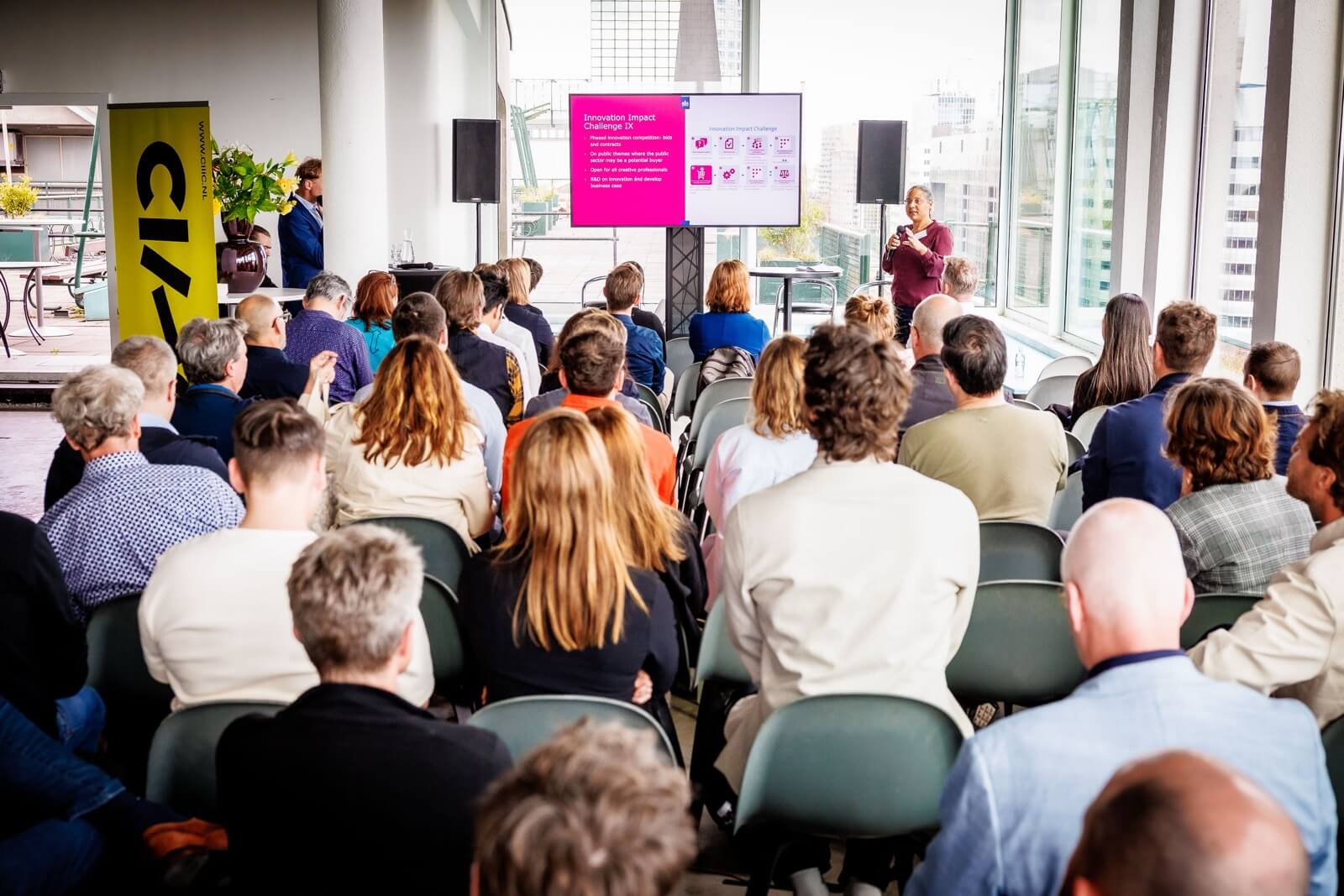 Audience seated at CIIIC Annual Meet-up, listening to speaker presenting on innovation impact challenge at a professional event.