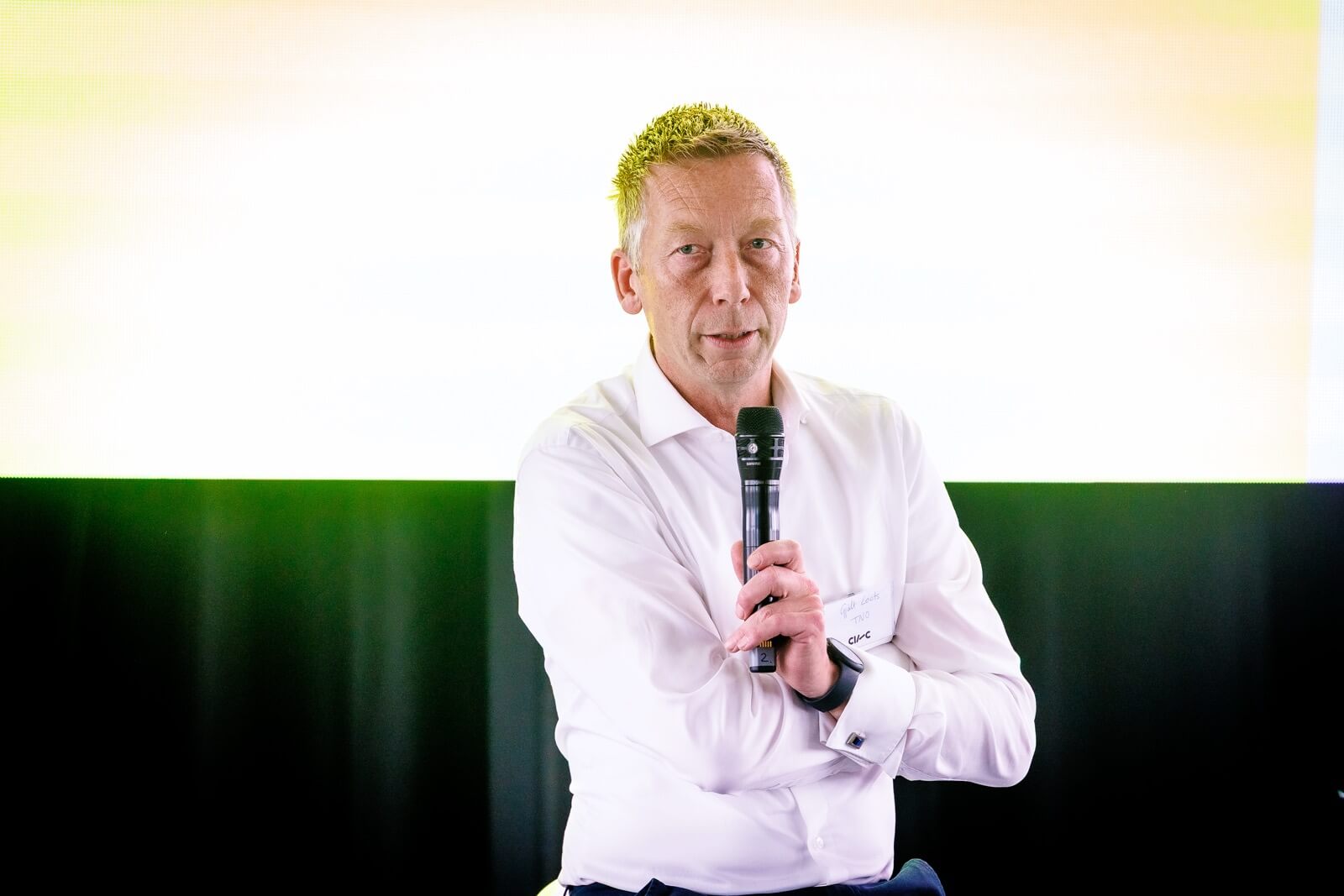 Man in white shirt speaking into a microphone at CIIIC Annual Meet-up. Bright background, focused on presenter.