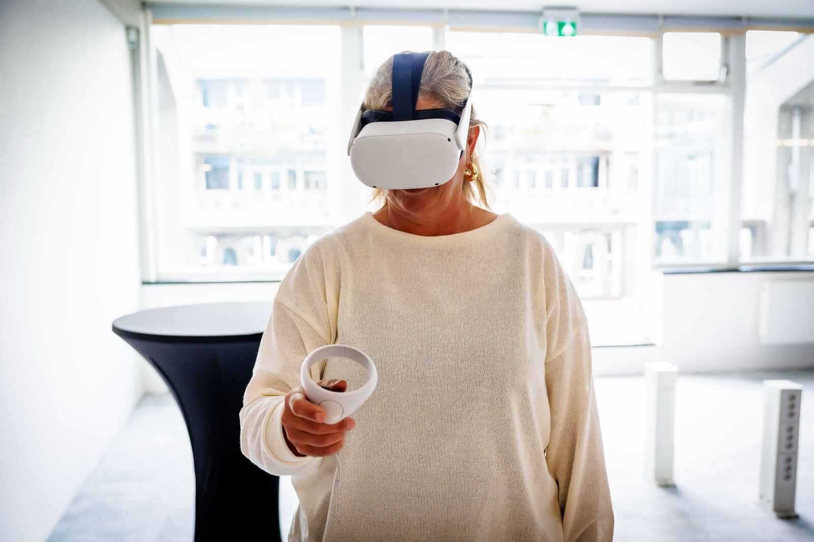 Woman wearing VR headset and holding a controller, engaged in a demonstration at the CIIIC Annual Meet-up event.