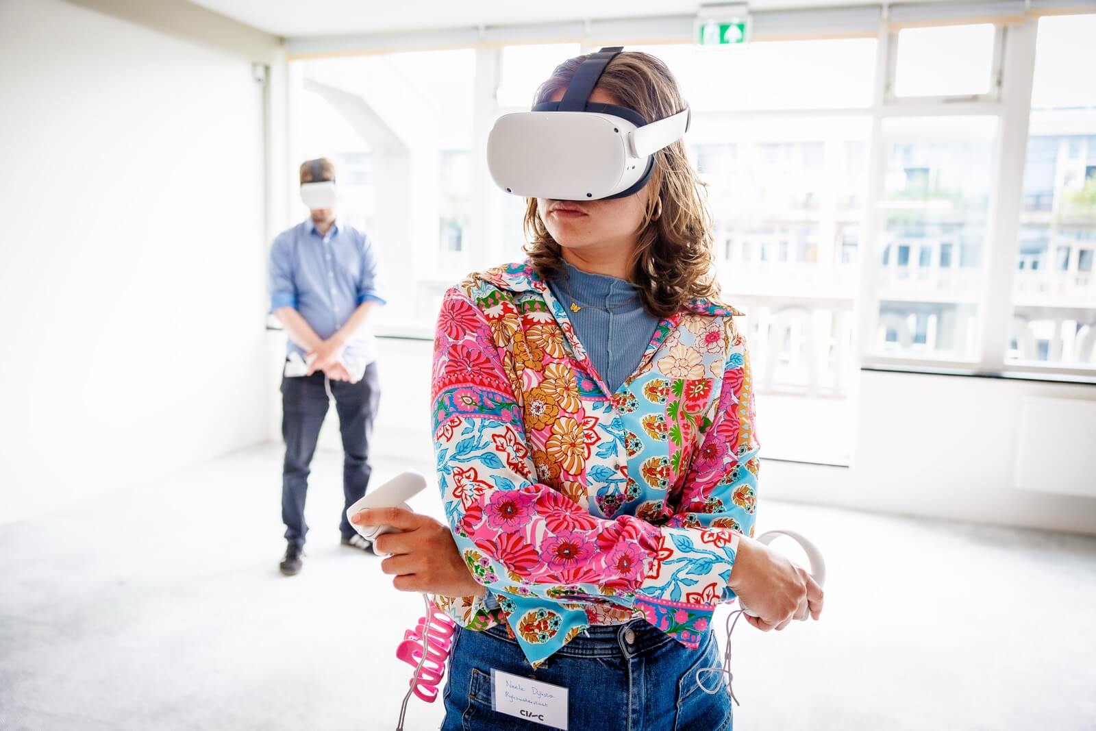 Person using VR headset and controllers in a brightly lit room during CIIIC Annual Meet-up; another person in background.