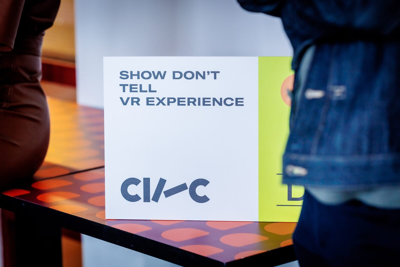 Sign reading "SHOW DON'T TELL VR EXPERIENCE" at the CIIIC event, on a polka-dotted table.