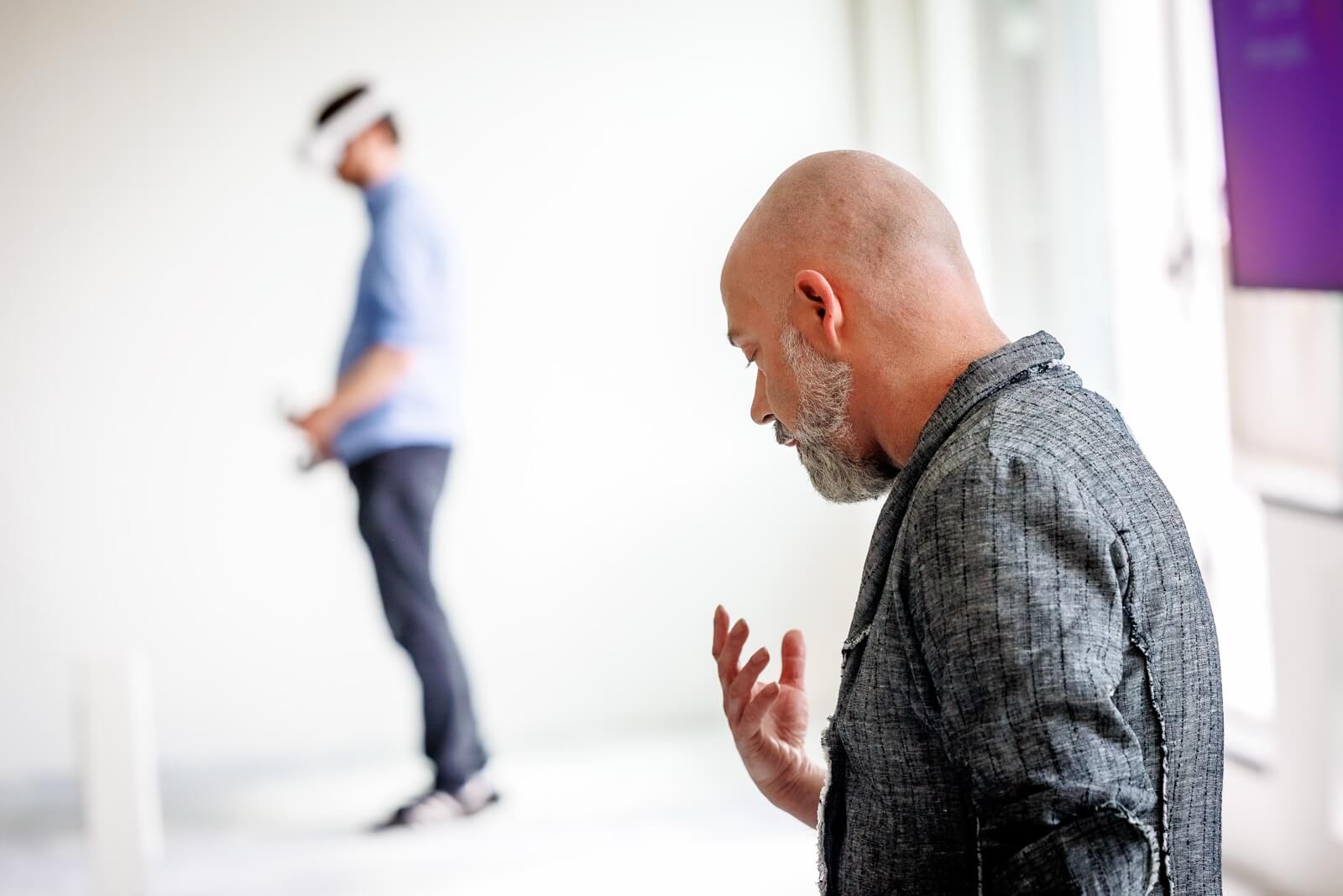 Bald man in focus with hand raised, gesturing; blurred man in background wearing VR headset at CIIIC Annual Meet-up.
