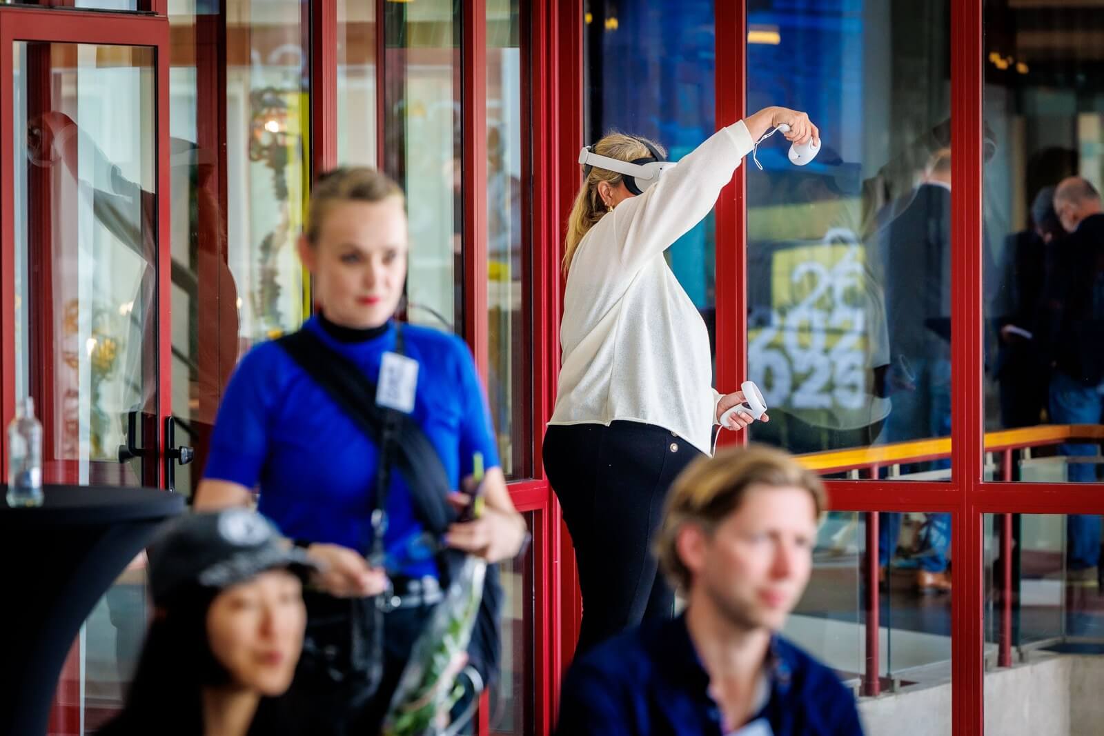 Person in white using VR headset and controllers at CIIIC Annual Meet-up, blurred attendees in foreground.