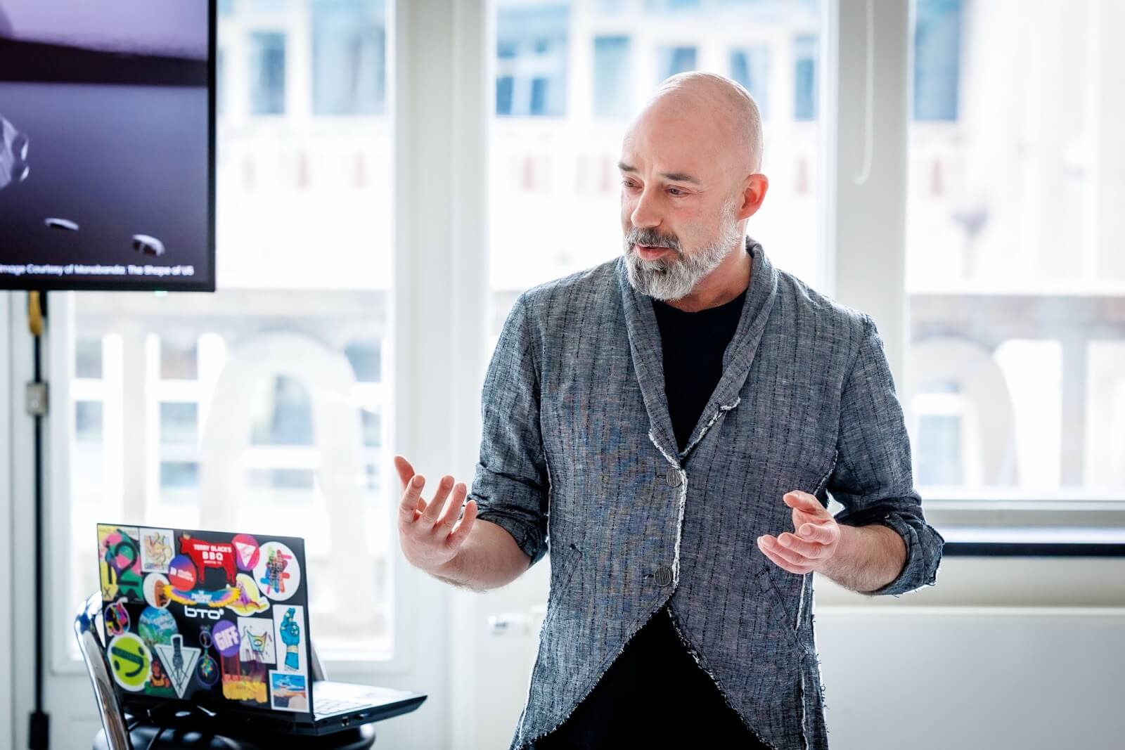 Bald man with beard gestures during a presentation next to a laptop with colorful stickers at the CIIIC Annual Meet-up.