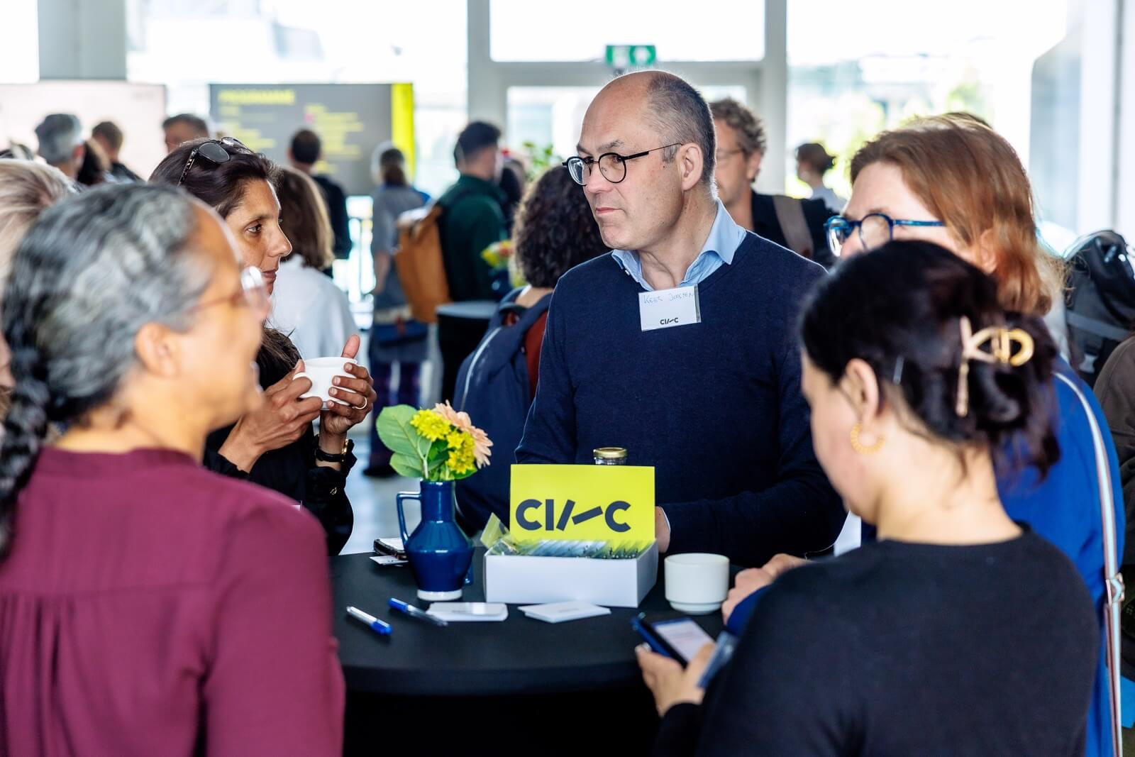 Group of people networking at CIIIC event, conversing and holding cups, with name tags and table with flowers.