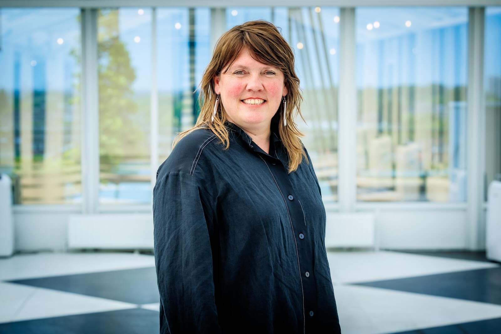 Smiling woman in a black shirt standing indoors at the CIIIC Annual Meet-up, with large windows in the background.
