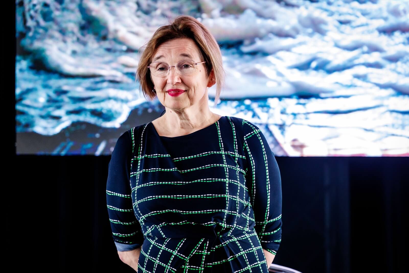 Woman in a plaid suit speaks at a podium during a professional event, with colorful flowers in the background.