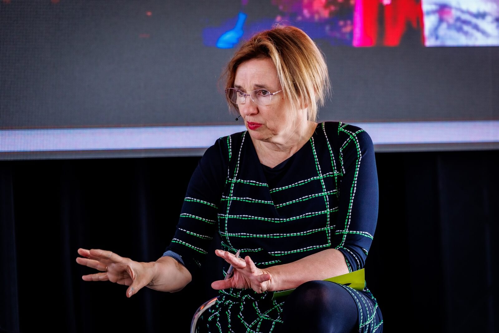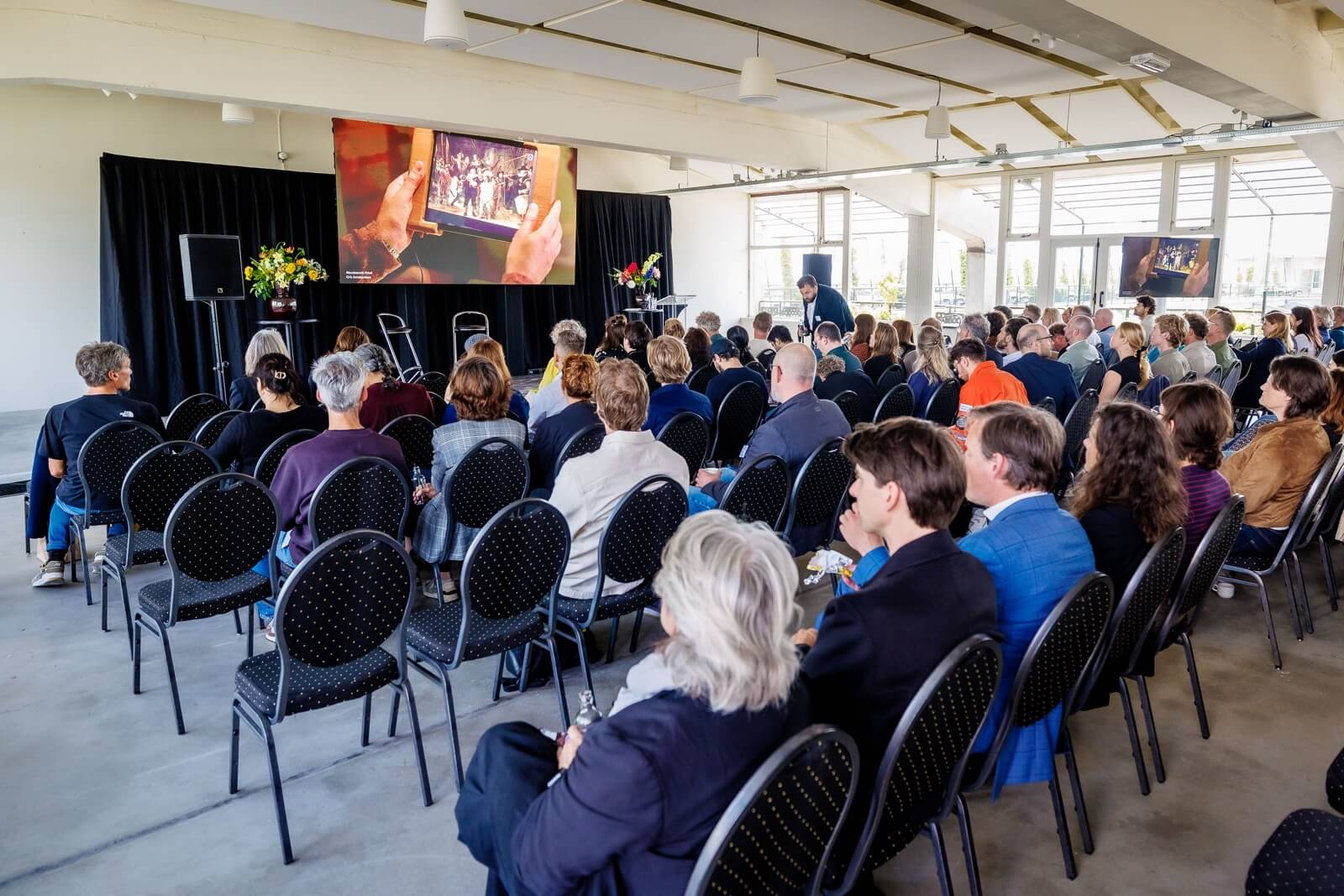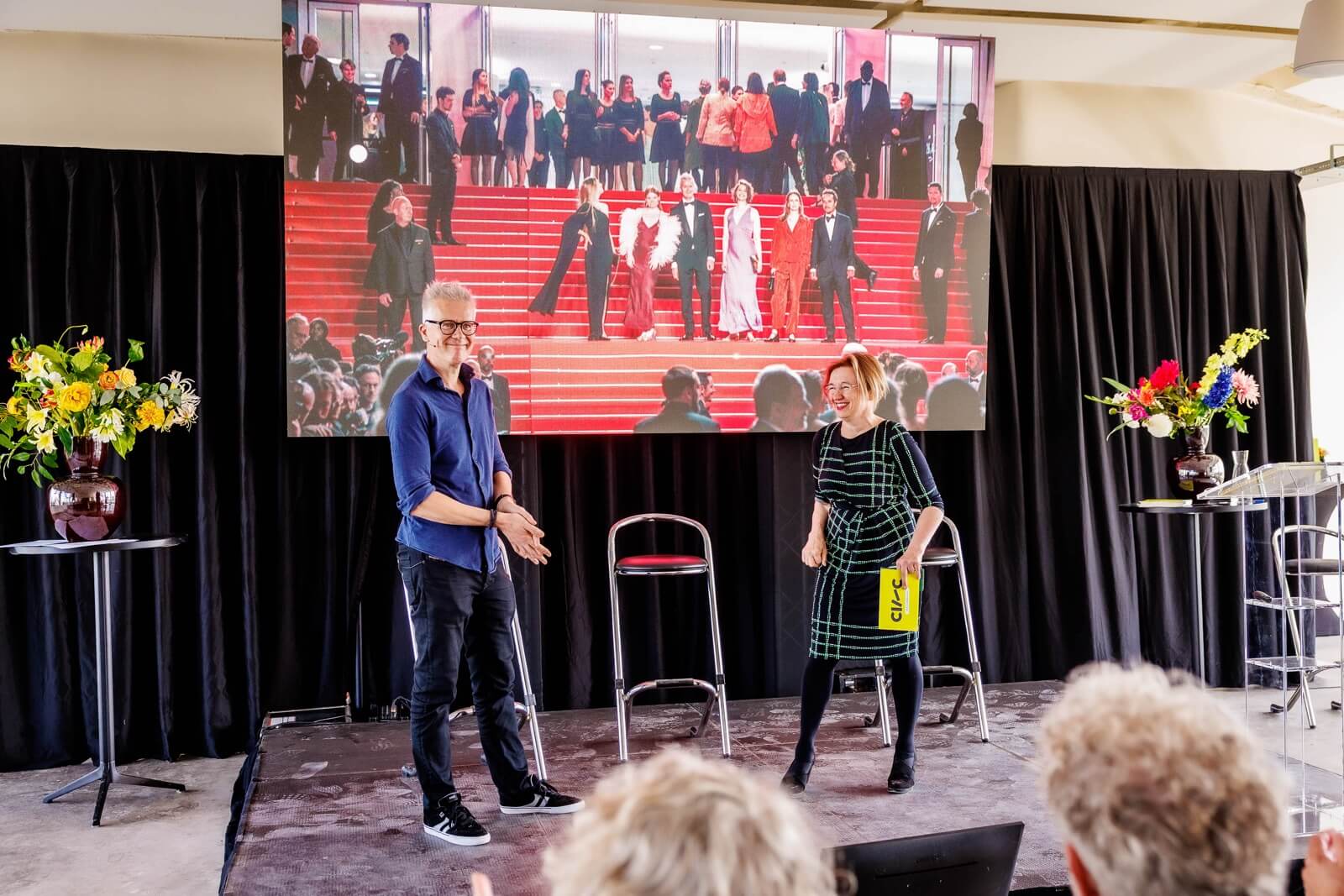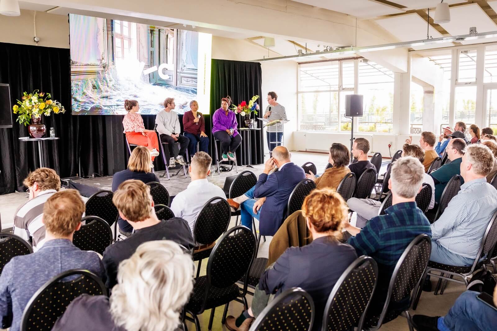 On stage, from left to right: Joost Raessens, Corinne Meijer, and Heleen Rouw.