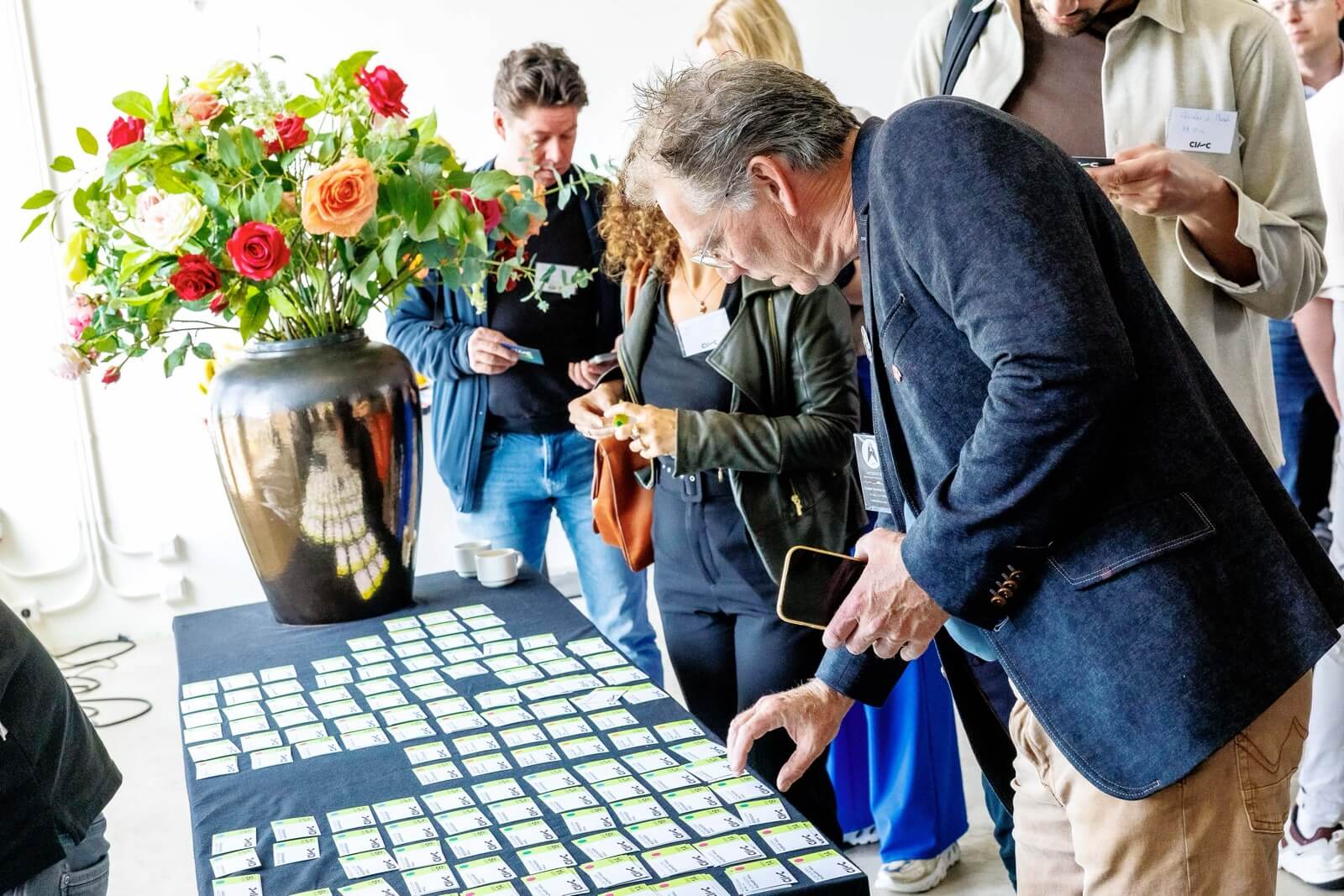 People at CIIIC Annual Meet-up analyzing a wall map, with name tags displayed on tables and others mingling in the background.