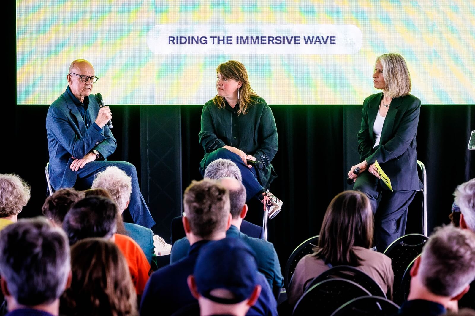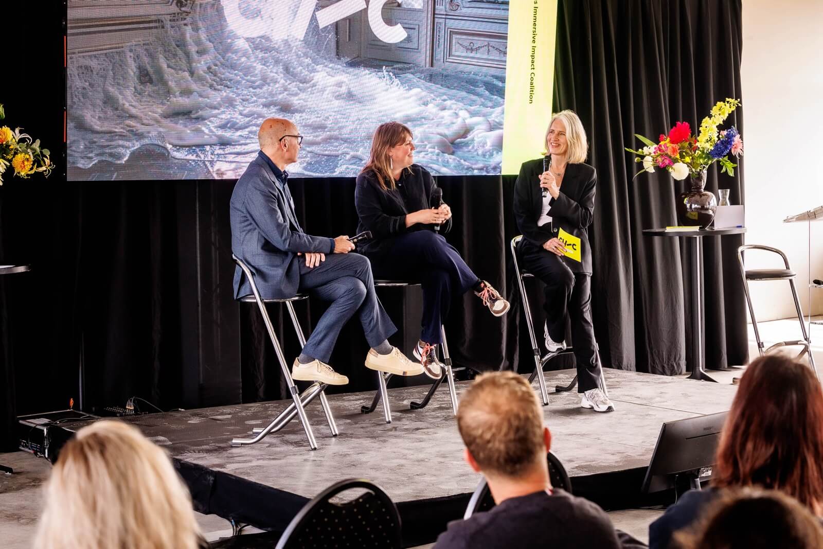 Three panelists on stage discuss at the CIIIC Annual Meet-up. The backdrop reads, "Riding the Immersive Wave."