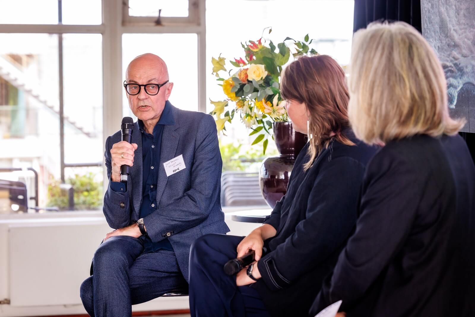 Three people seated at the CIIIC Annual Meet-up, with one holding a microphone, discussing during a panel session.