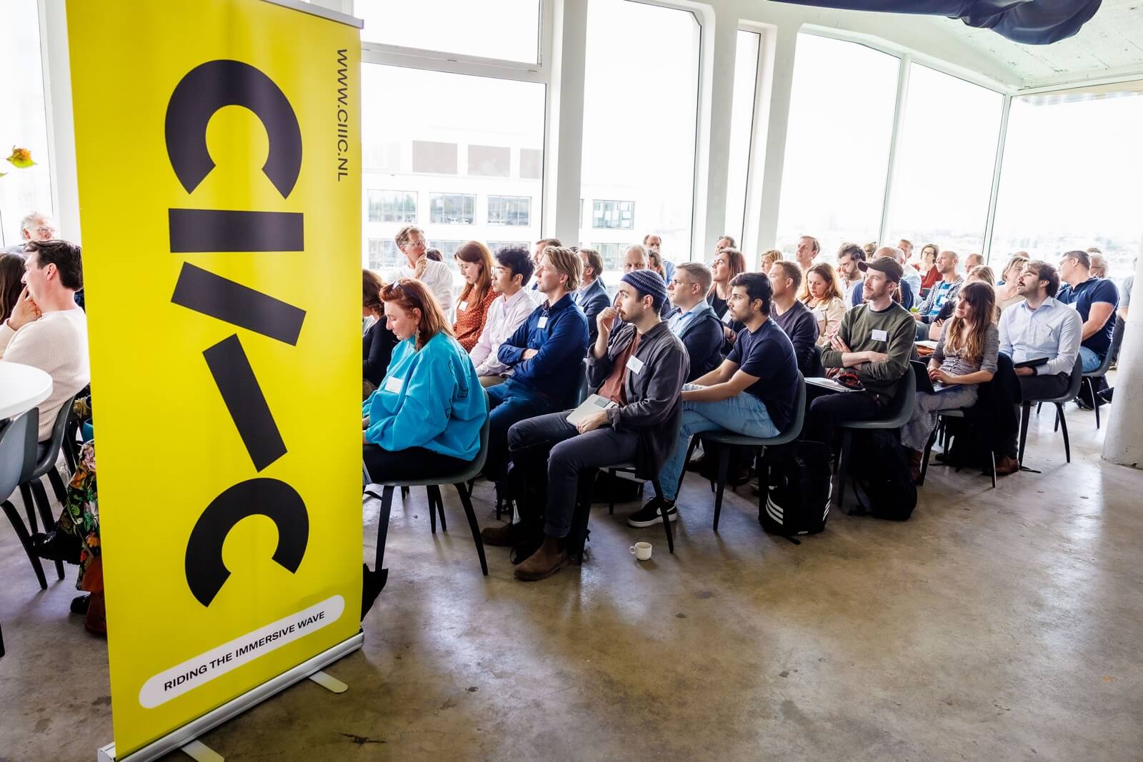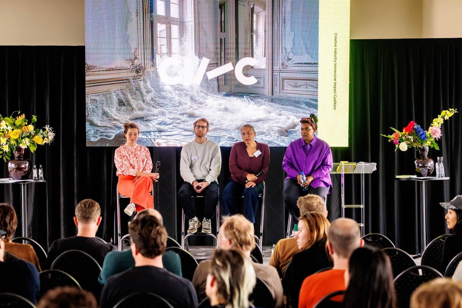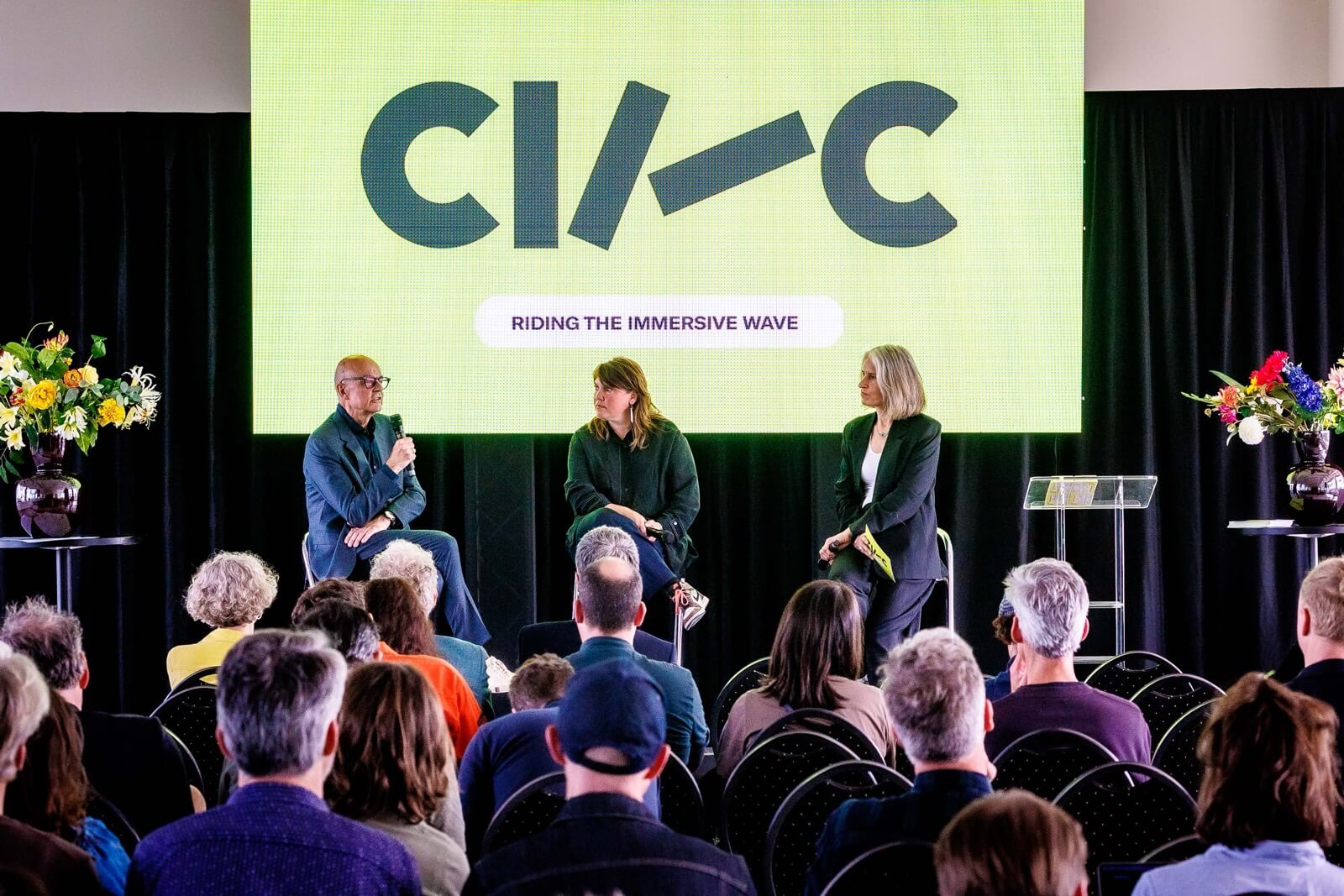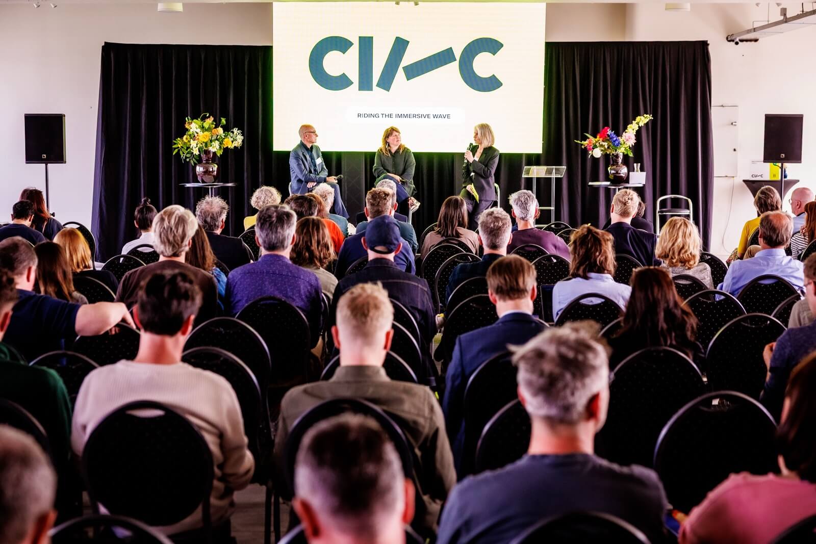 Panelists holding microphones speak at the CIIIC Annual Meet-up, with an audience watching, under the sign "Riding the Immersive Wave".