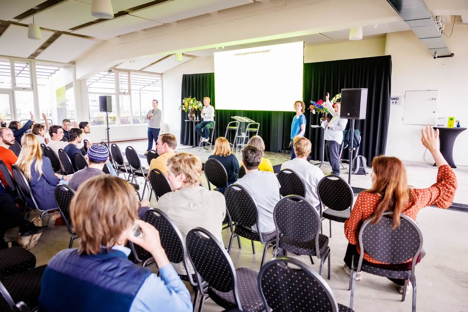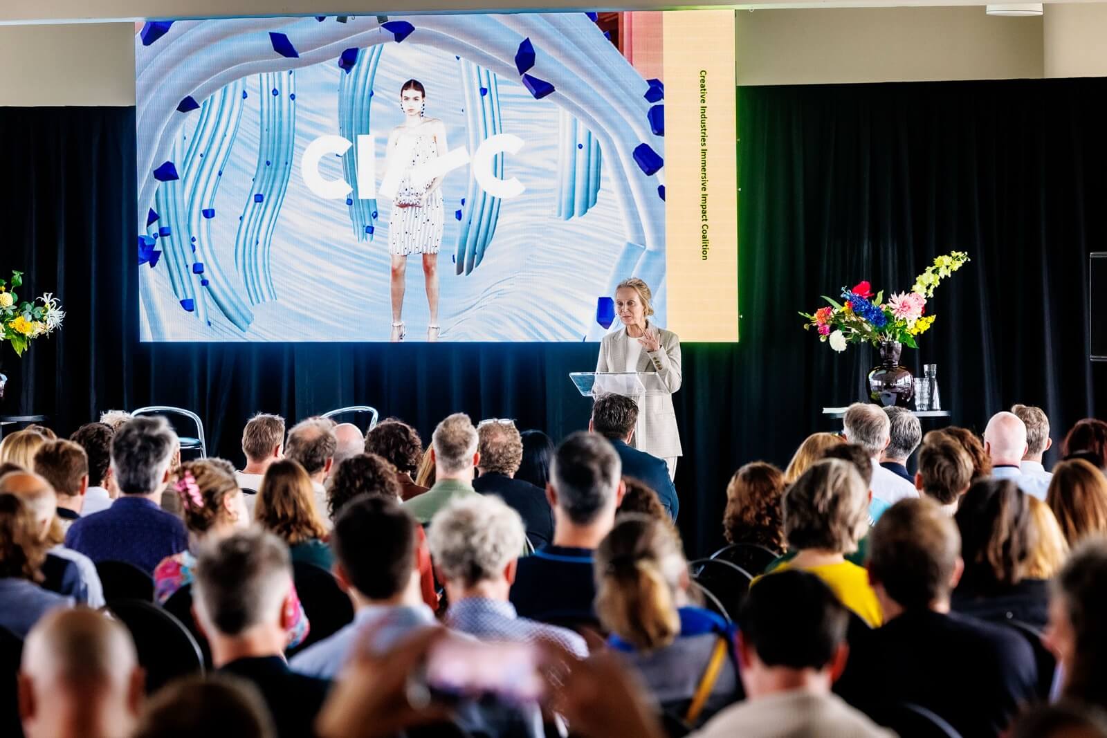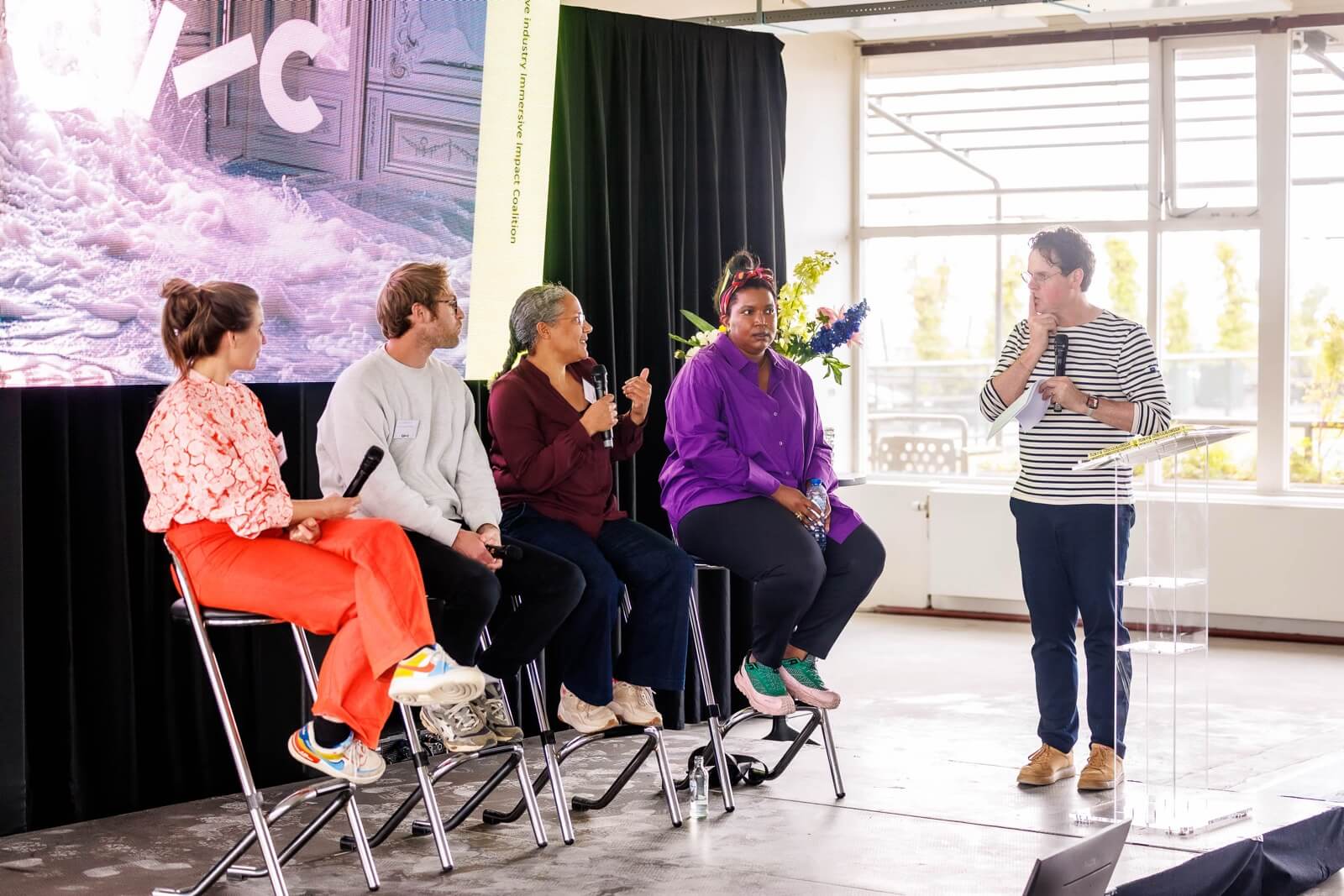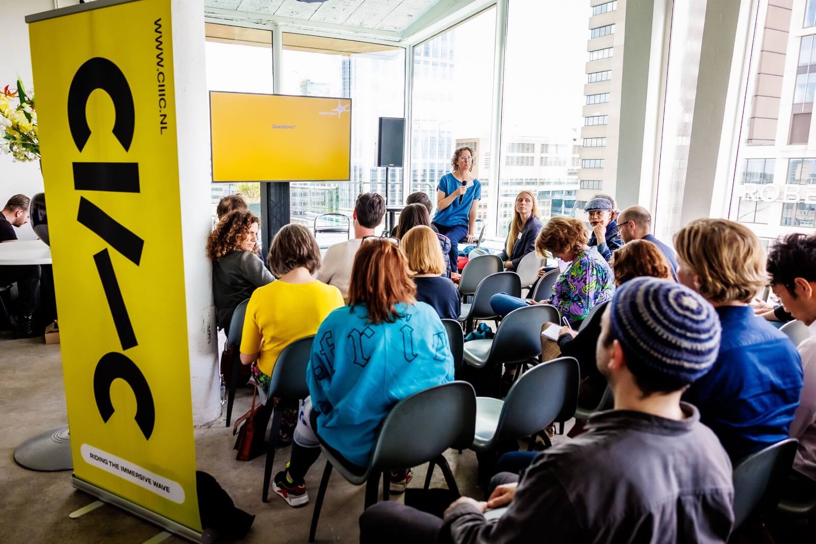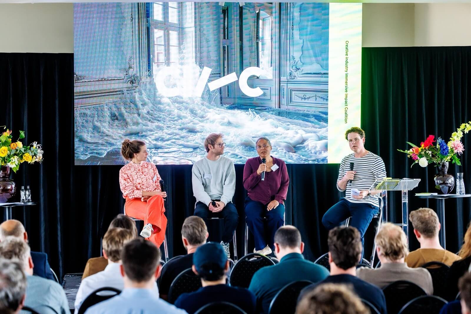 Panelists holding microphones speak at the CIIIC Annual Meet-up, with an audience watching, under the sign "Riding the Immersive Wave".