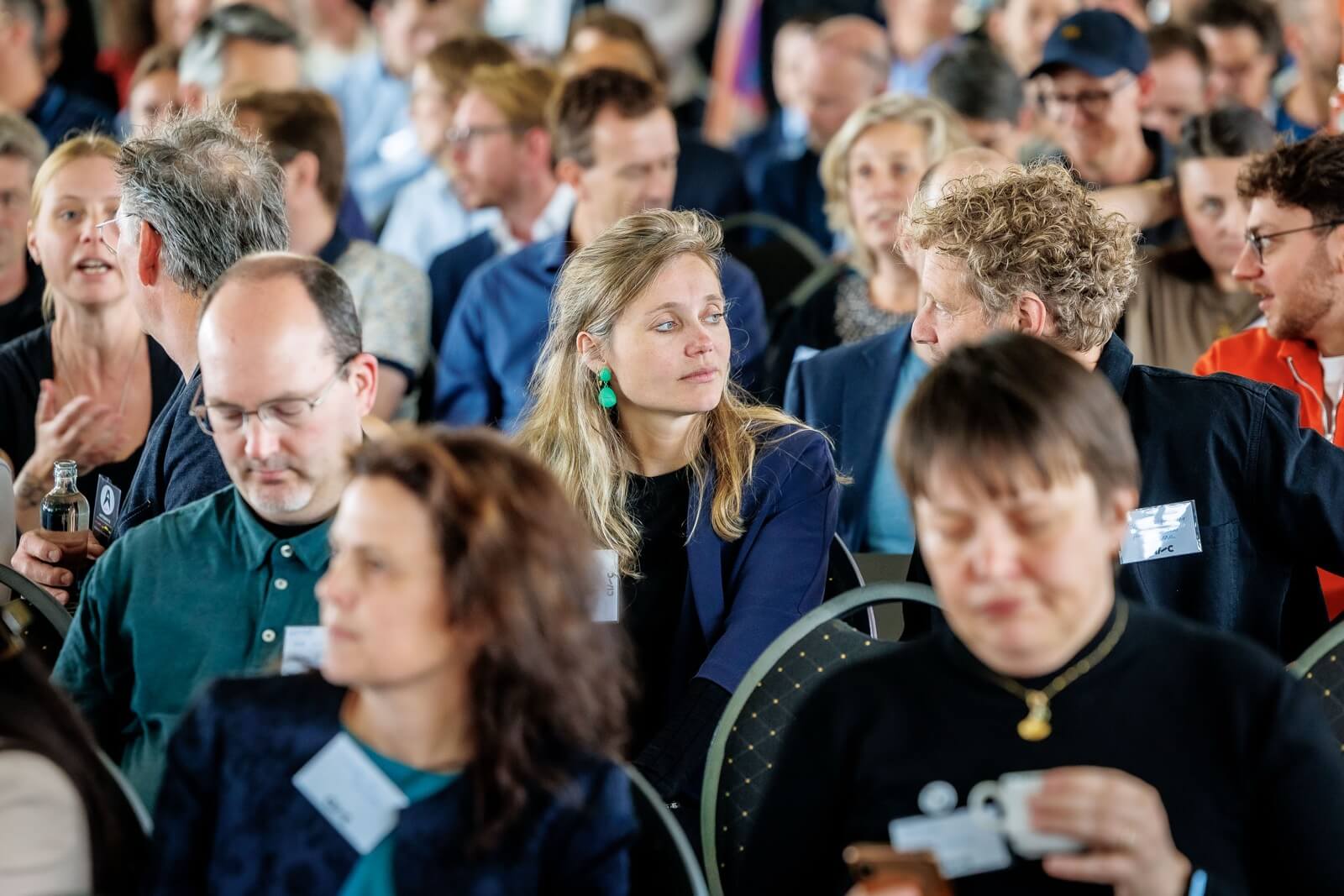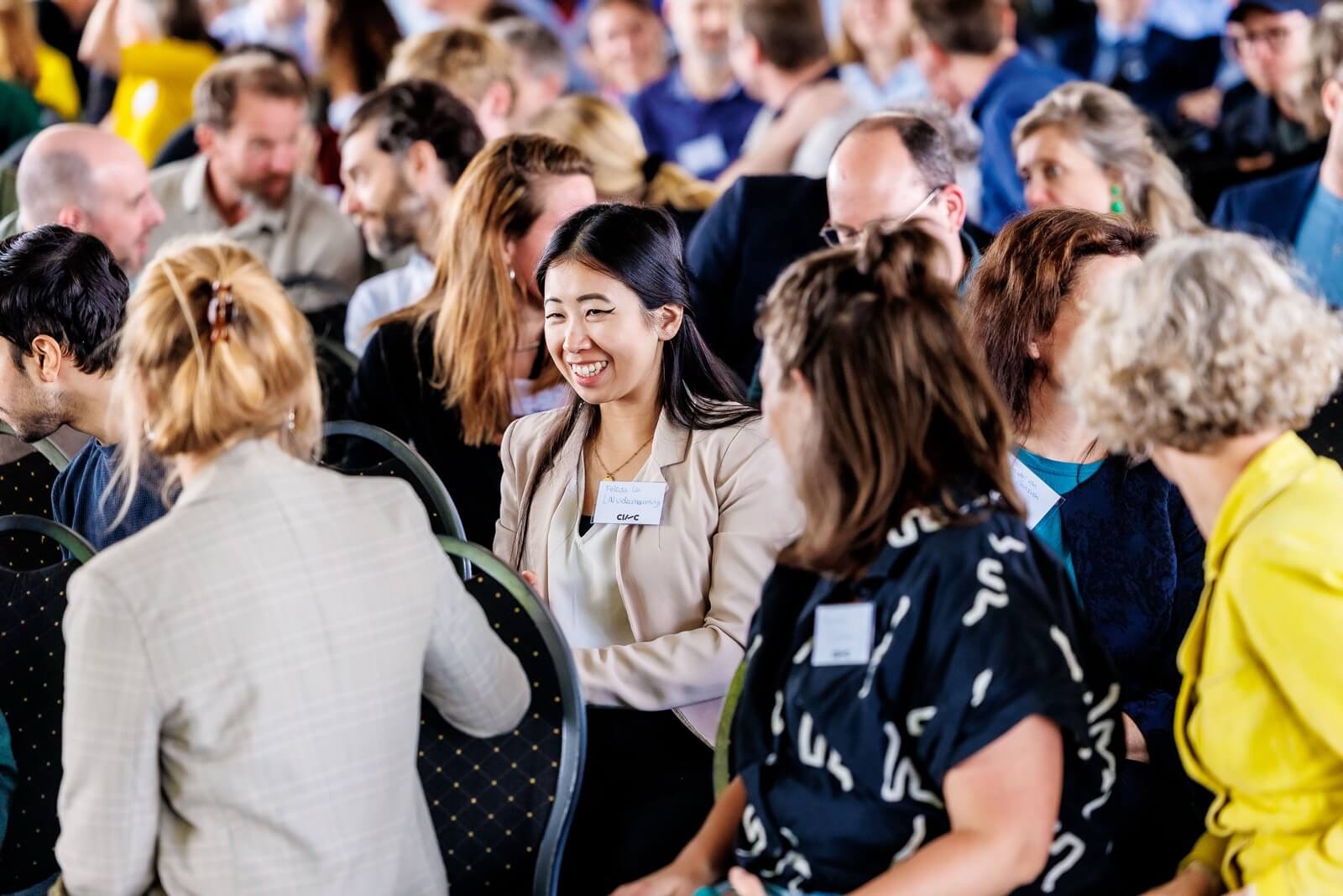 Audience at CIIIC Annual Meet-up, many raising hands, in a bright, spacious venue with large windows.