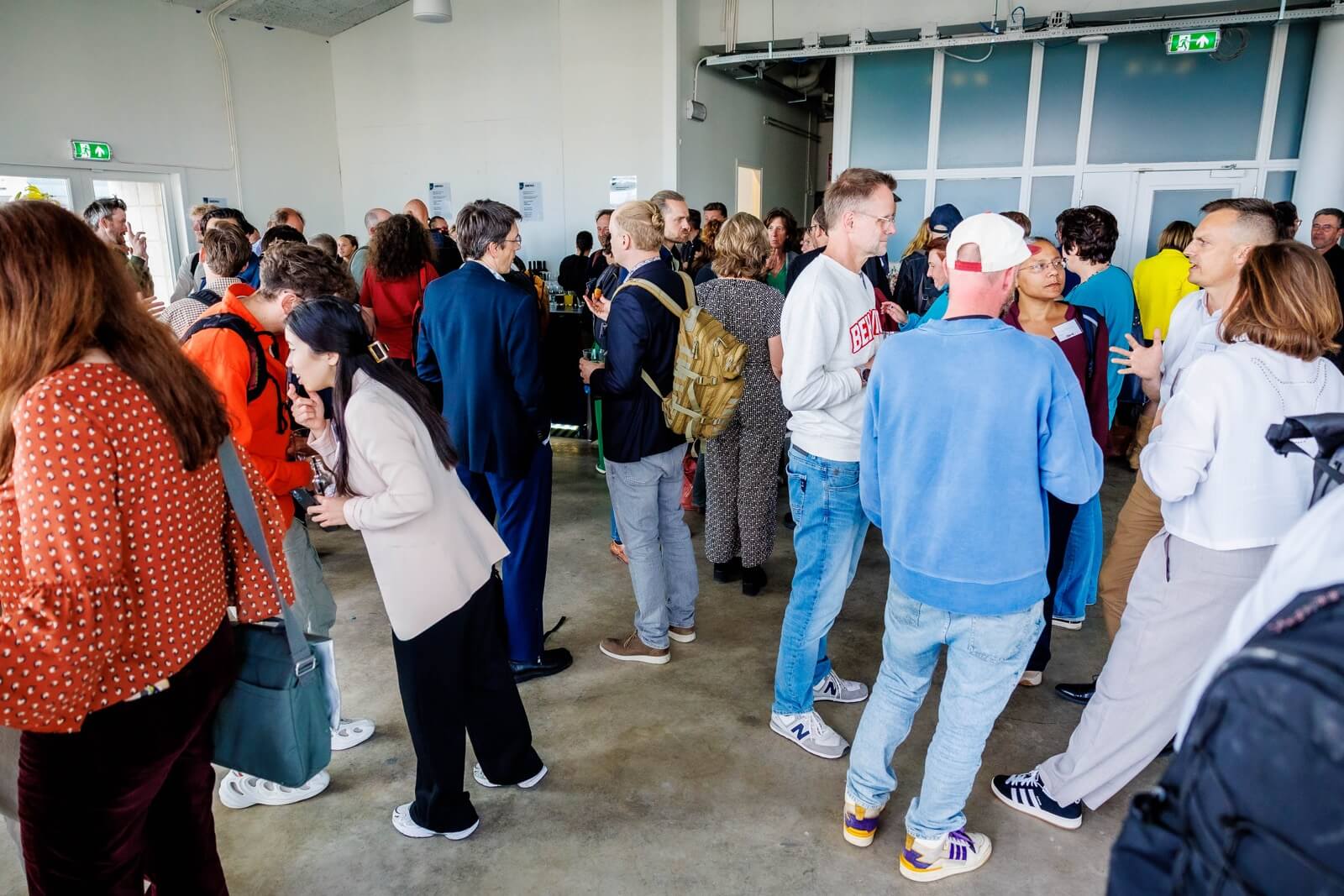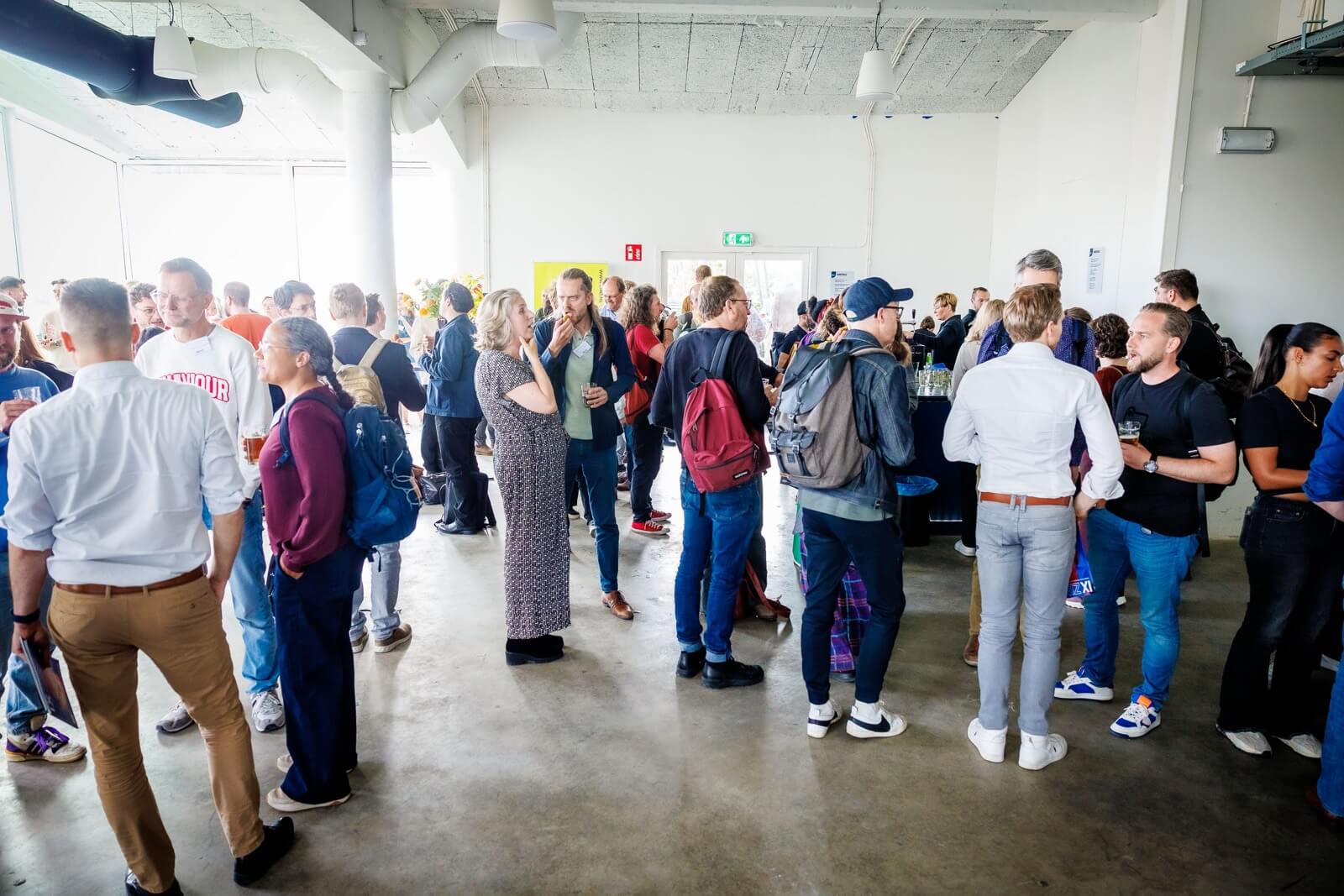 Crowded networking area at CIIIC Annual Meet-up with attendees chatting and mingling in a bright, open room.