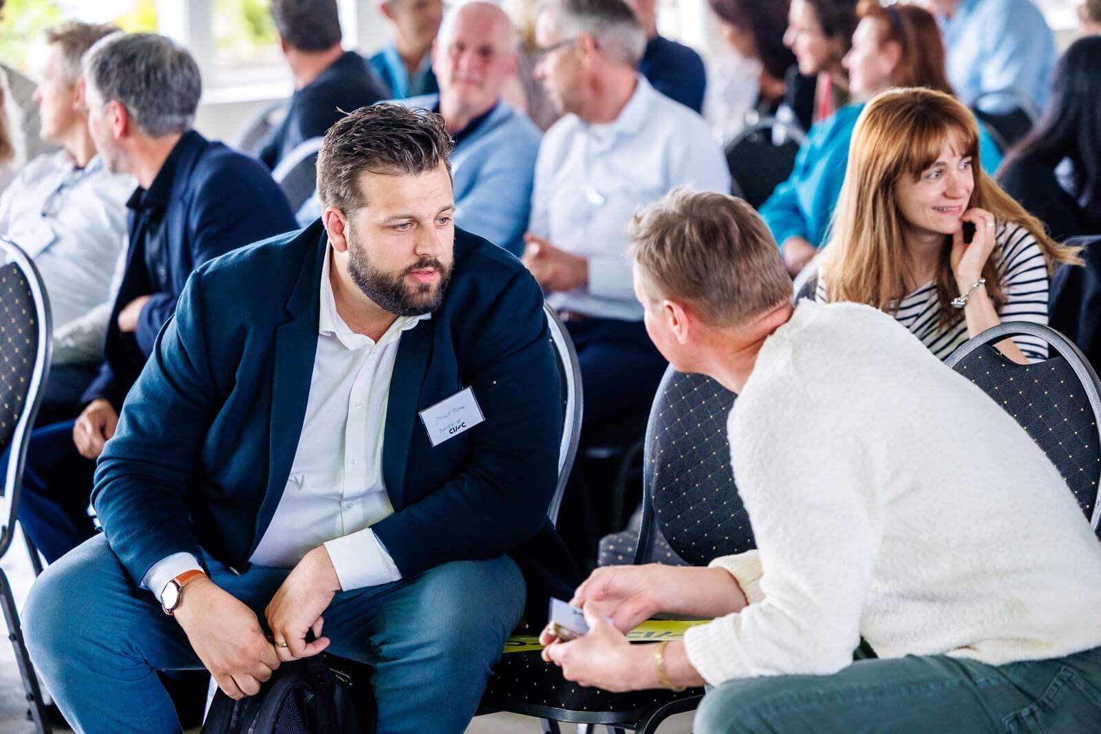 Two men engaged in conversation at a professional event while others are seated in the background.