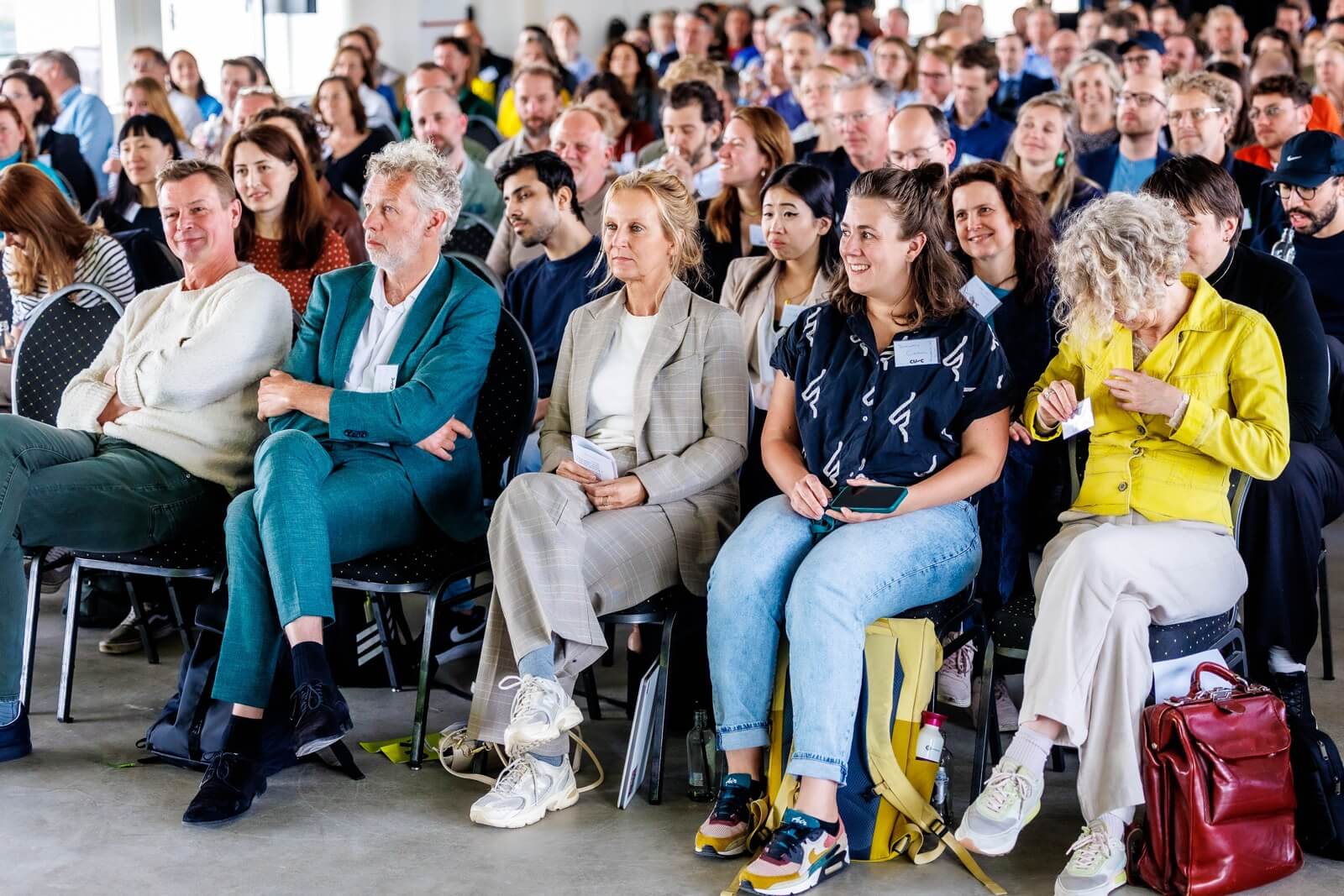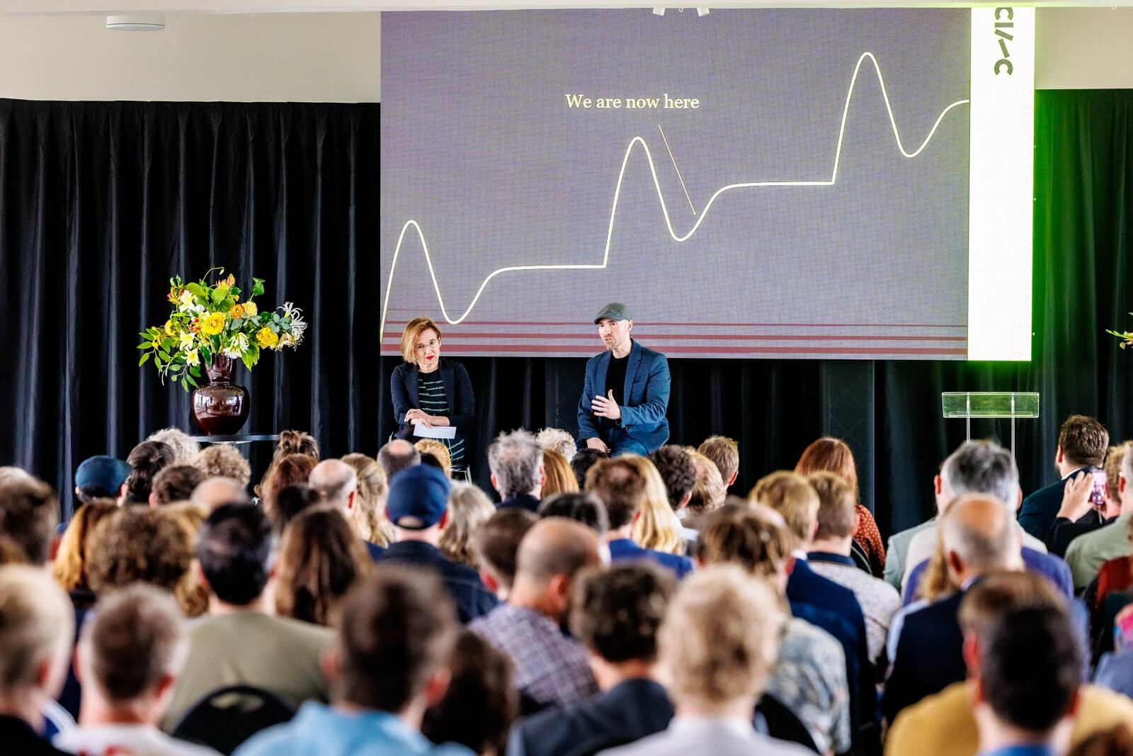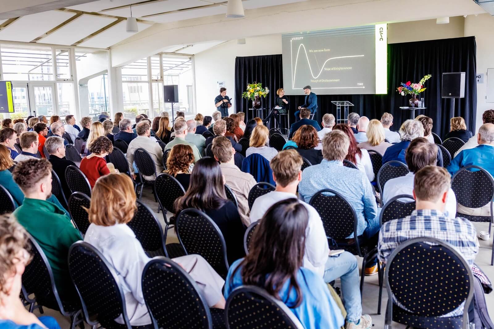 Audience seated facing a stage with two speakers and a presentation at a professional event.