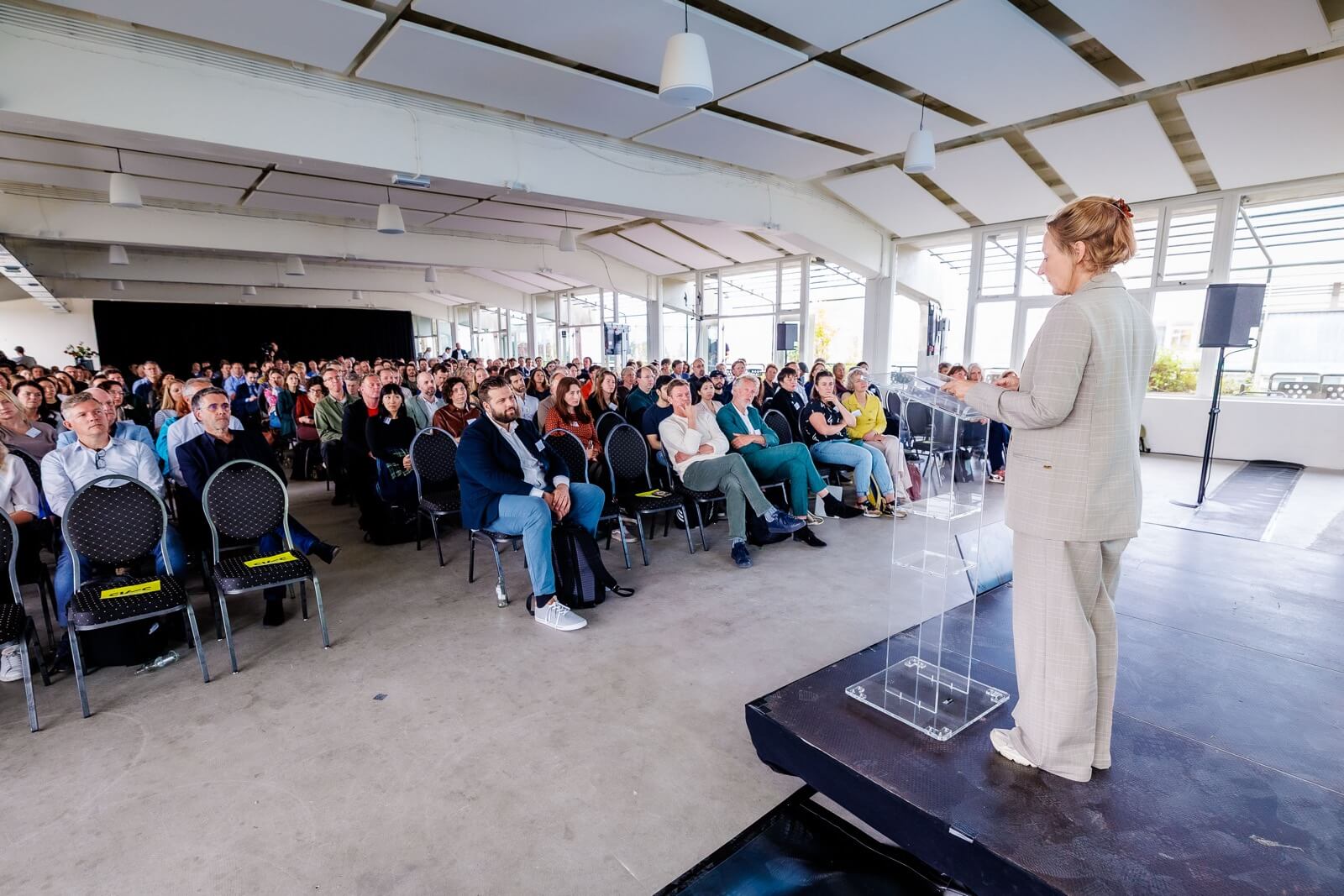 Speaker addressing a large audience at the CIIIC Annual Meet-up in a bright, modern conference room.