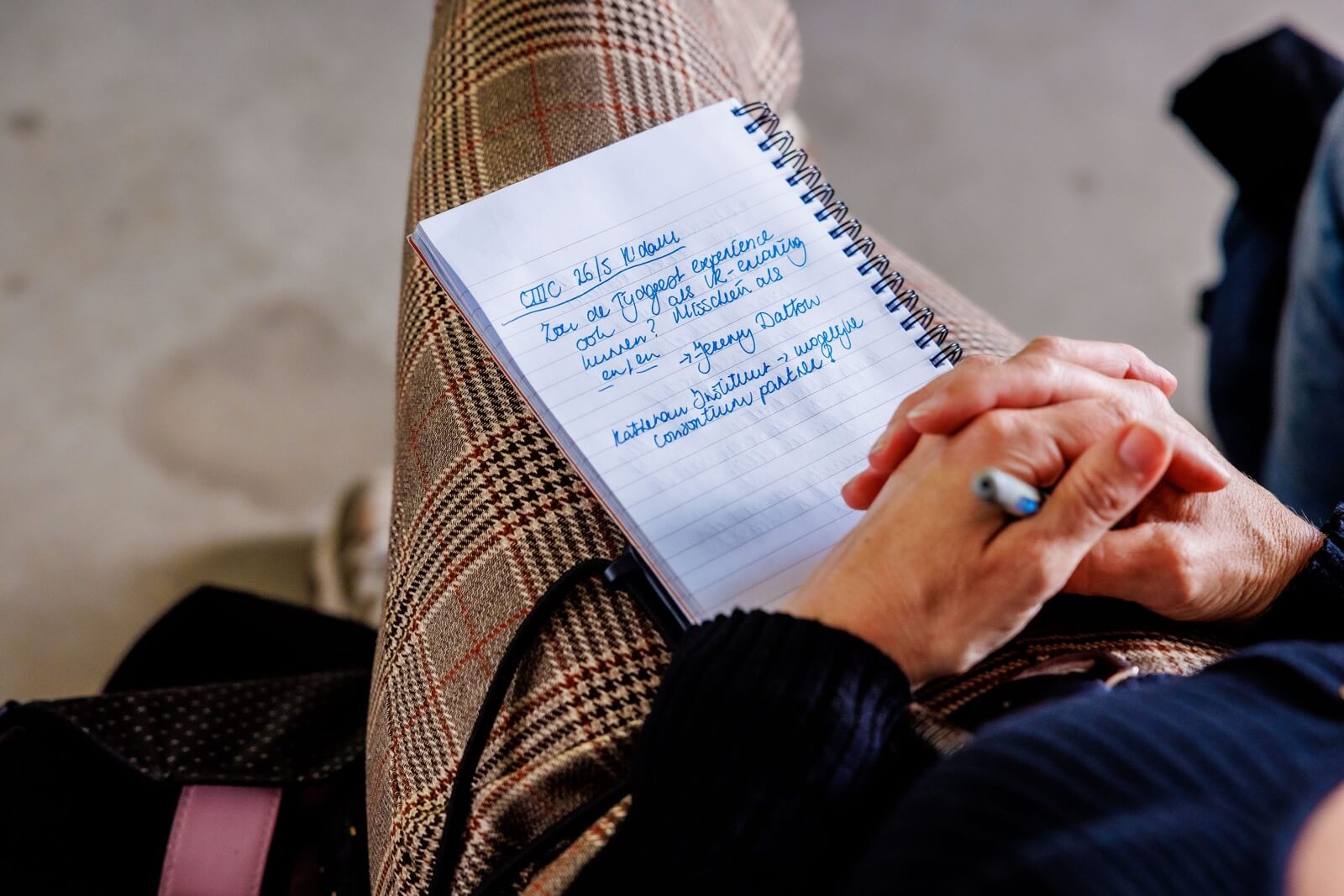 Close-up of a person holding a pen with a notepad on their lap, containing handwritten notes at a professional event.