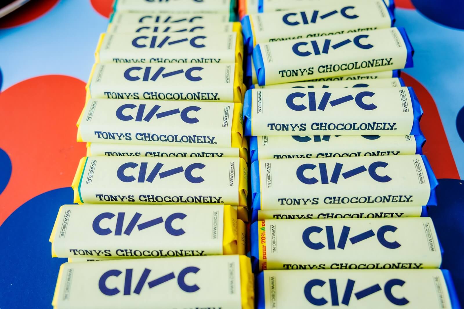 Rows of Tony's Chocolonely bars with CIIIC branding on colorful background at the CIIIC Annual Meet-up event.