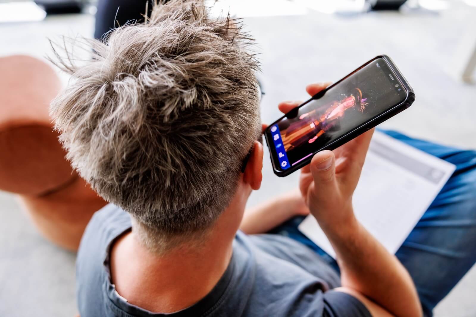 Man at event watching a video on his phone, with another person taking a photo in the background.