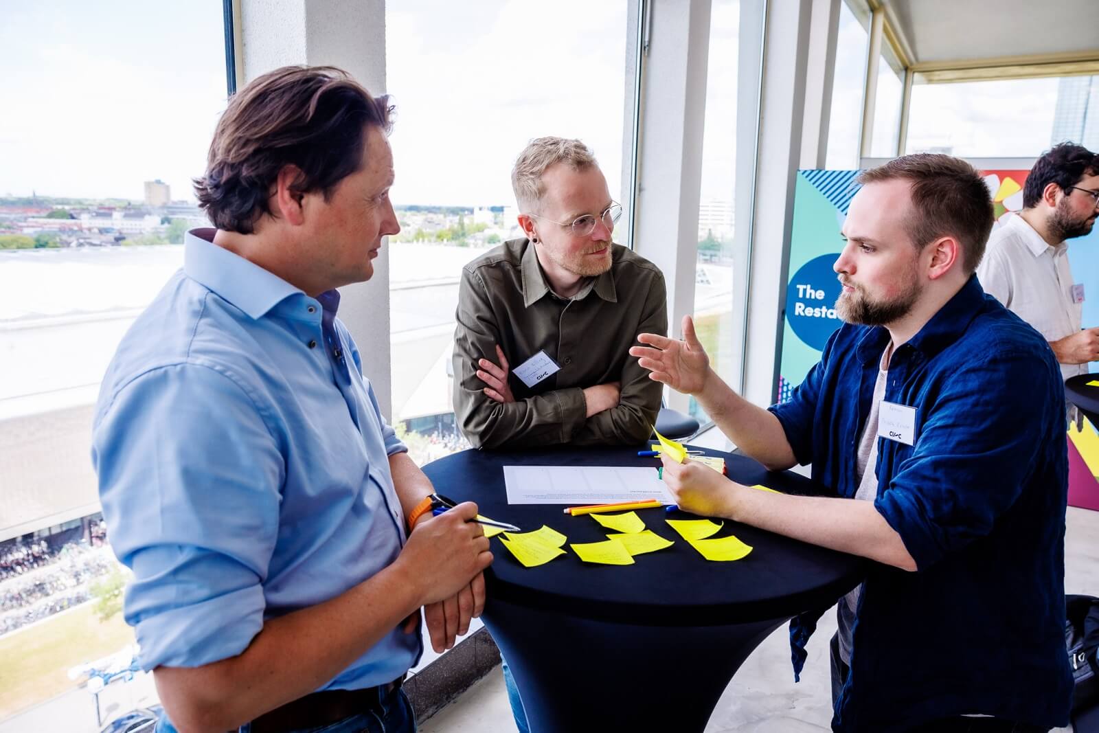 Three men engaged in discussion around a table with sticky notes at the CIIIC Annual Meet-up event.
