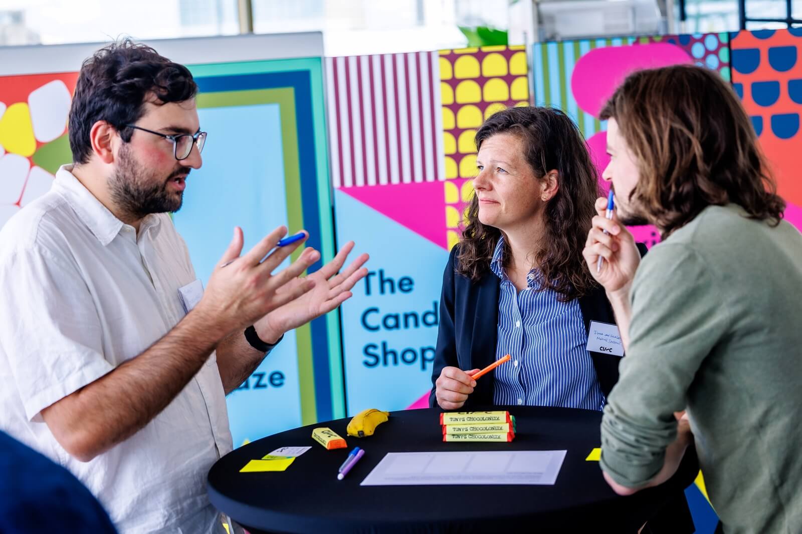 Three people engaged in discussion at a round table during the CIIIC Annual Meet-up, with colorful panels in the background.
