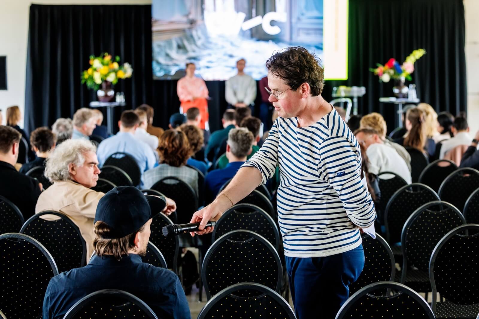 Person in striped shirt hands a microphone to an attendee in a crowded conference room with speakers on stage.