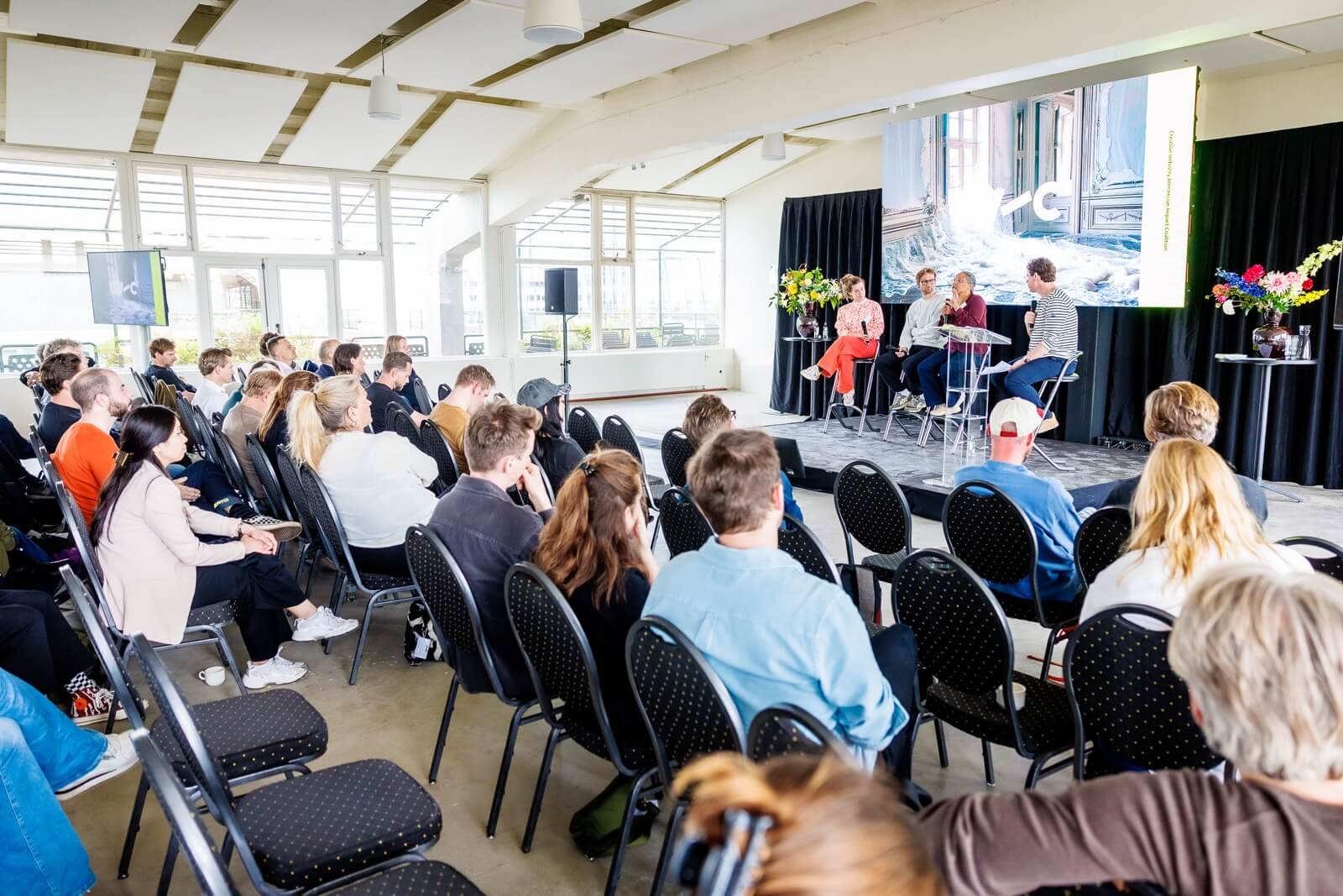Panelists seated on stage during a discussion at the CIIIC Annual Meet-up, with an audience watching attentively.