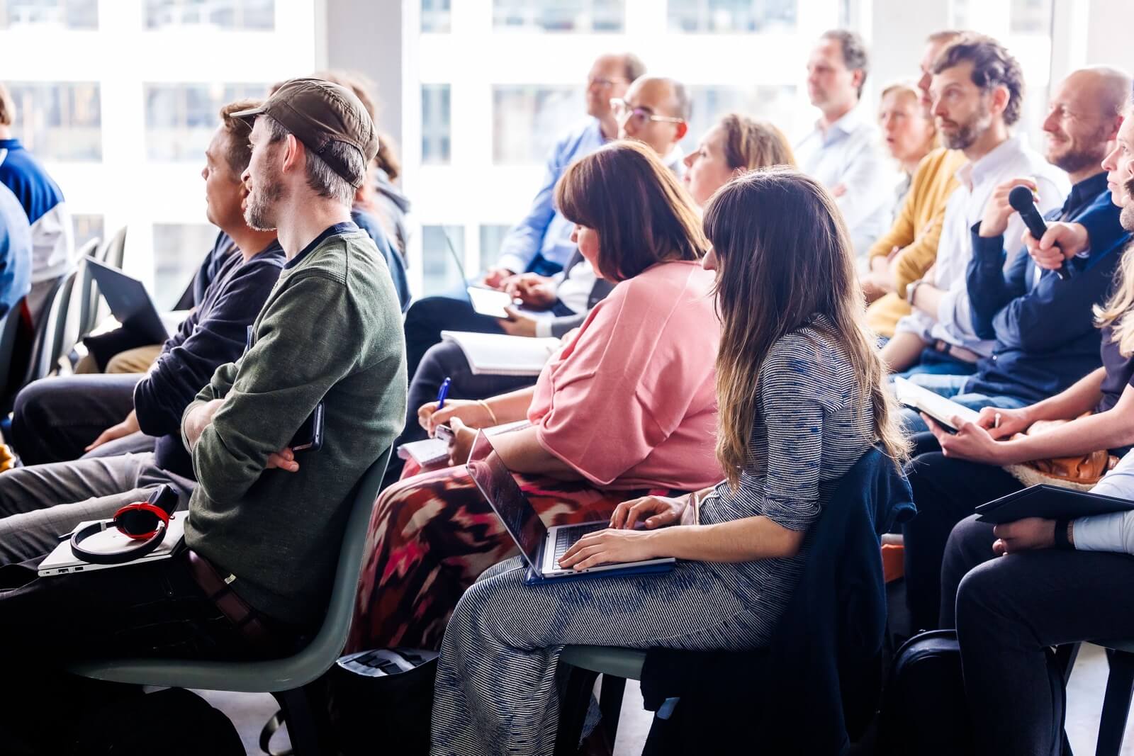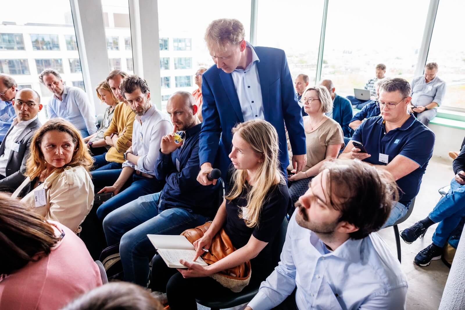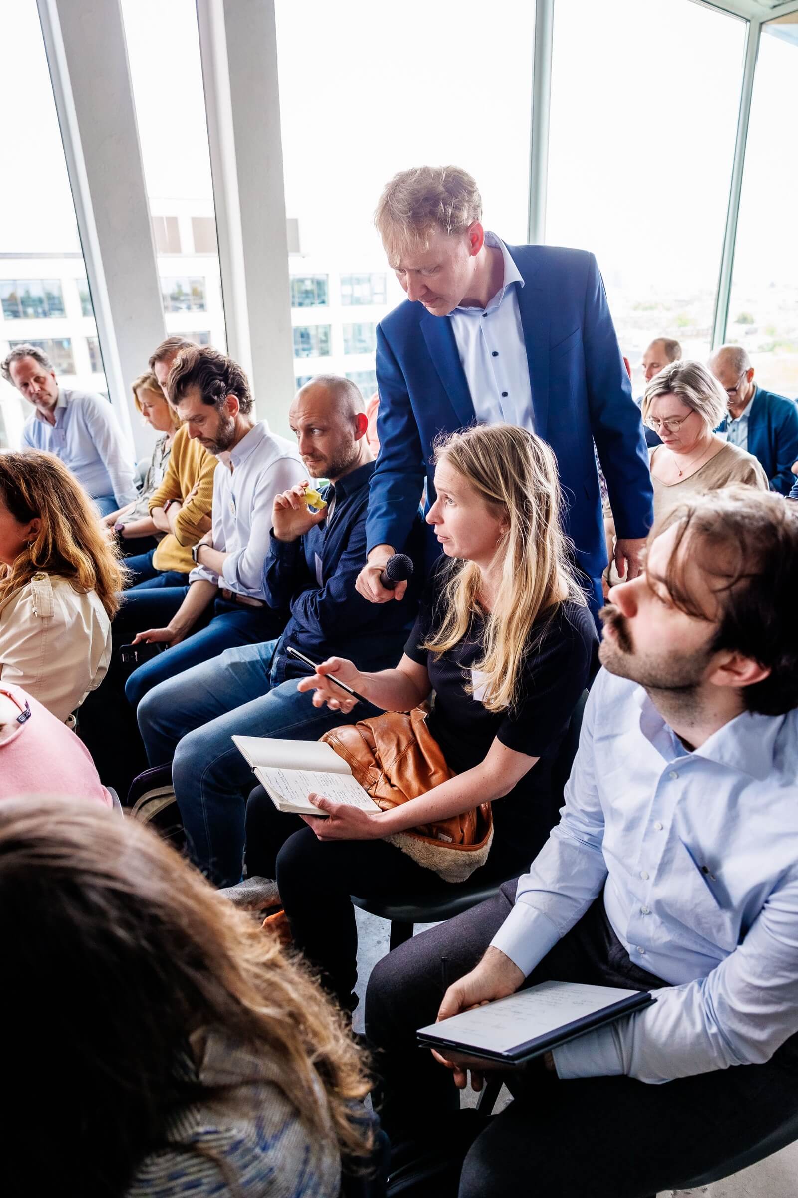 Attendees seated and taking notes during a professional meet-up, with one person holding a microphone.
