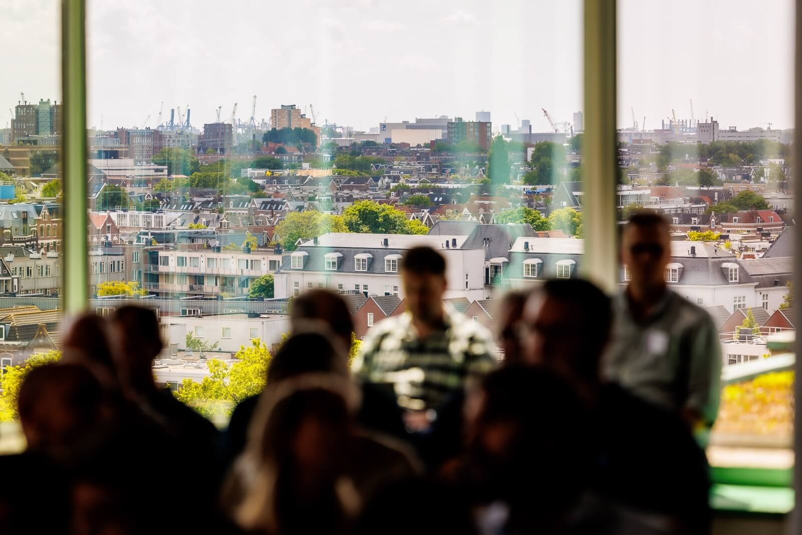 A group of people in a conference room with a large window view of a cityscape and cranes in the background.