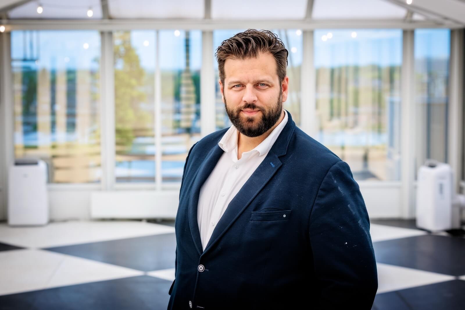 Man in a navy blazer poses confidently at CIIIC Annual Meet-up; bright, modern venue in background.