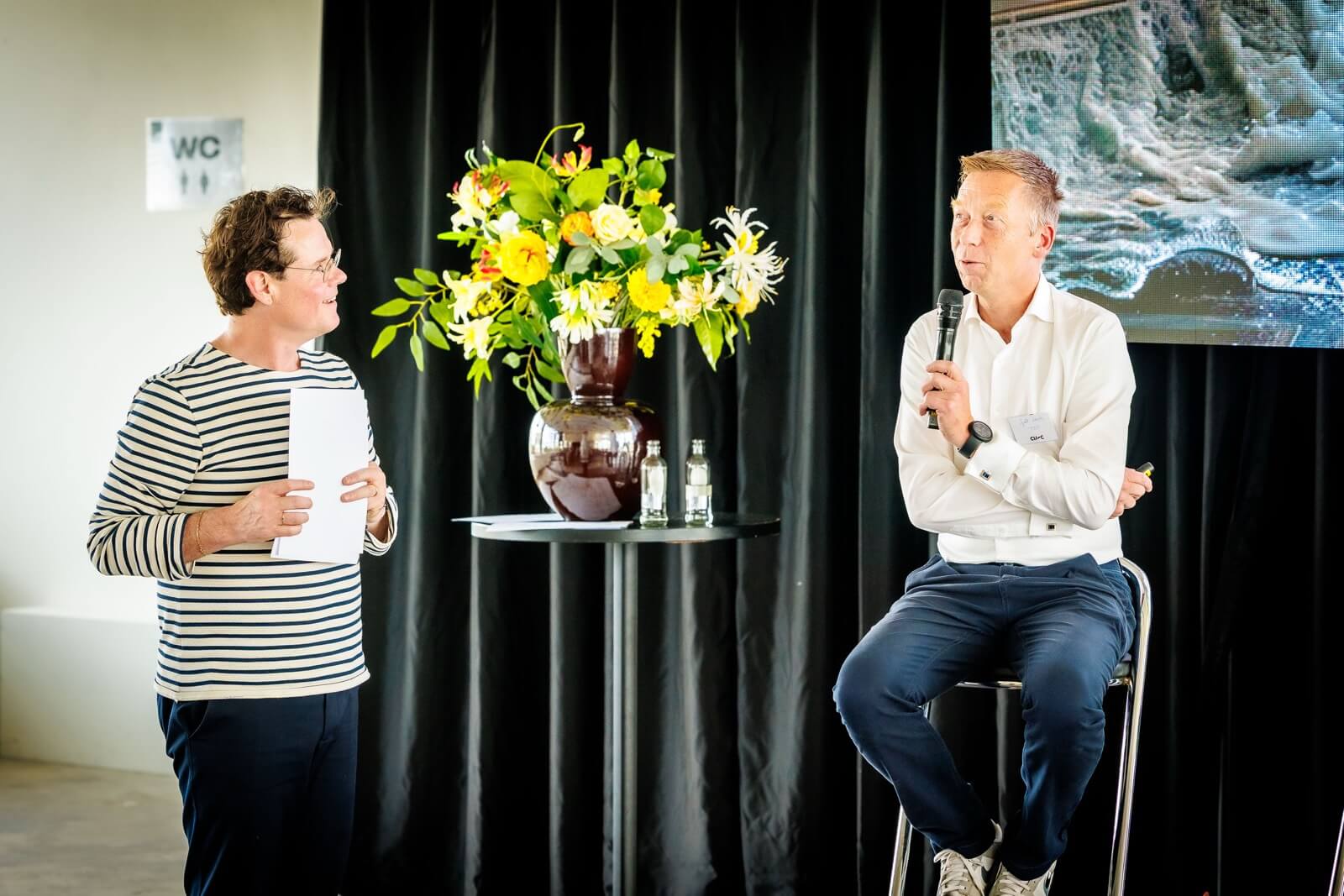 Two men engage in conversation on stage, one holding a microphone, with a floral arrangement on a table between them.