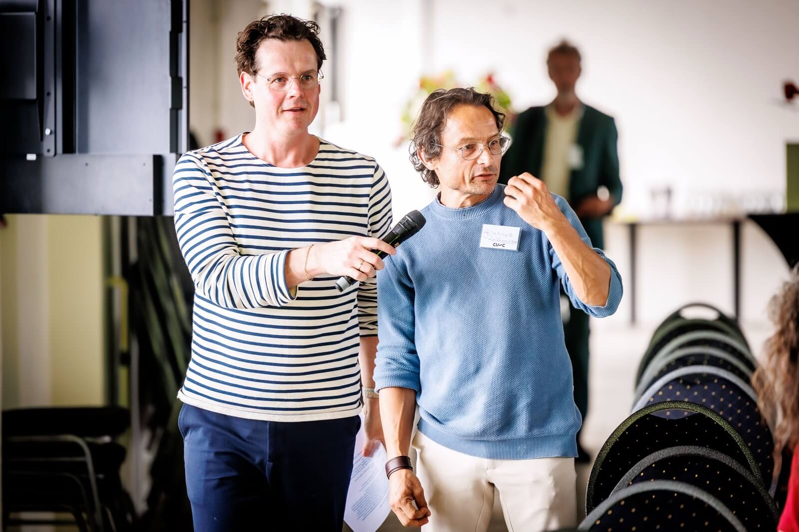 Two men speaking at the CIIIC Annual Meet-up, one holding a microphone, standing in a professional setting with chairs.