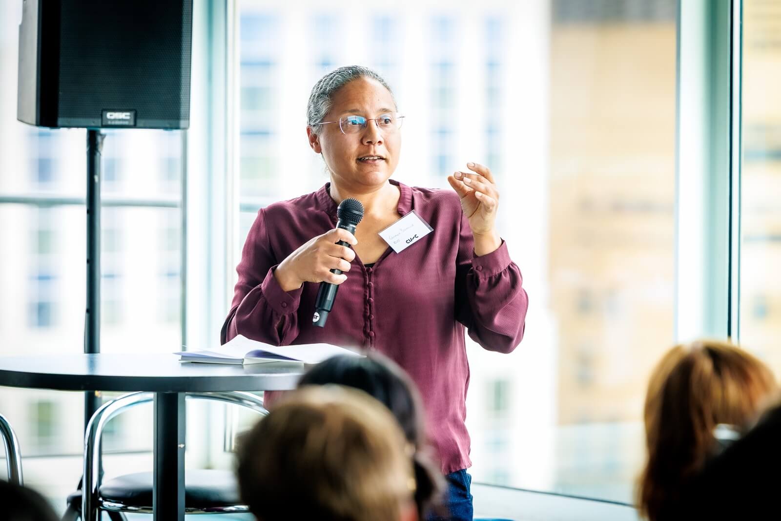 A woman holds a microphone, standing among seated attendees at the CIIIC Annual Meet-up event.